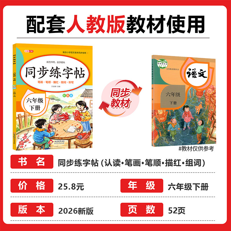 【老师推荐】六年级下册练字帖(人教版)是与小学语文教材同步的专用钢笔字帖,专为小学六年级学生设计。本字帖紧扣课本生字、词语及重点句段,一课一练,帮助学生巩固课堂所学,提升书写规范性与美观度。采用田字格规范书写,笔顺清晰,结构准确,适合每日练习。通过“每日一练”“课课练”的形式,循序渐进培养良好书写习惯,提高硬笔书法水平。字帖内容实用、编排科学,是老师推荐、家长信赖的同步练字好帮手,助力学生在下学期语文学习与书写能力上双提升。