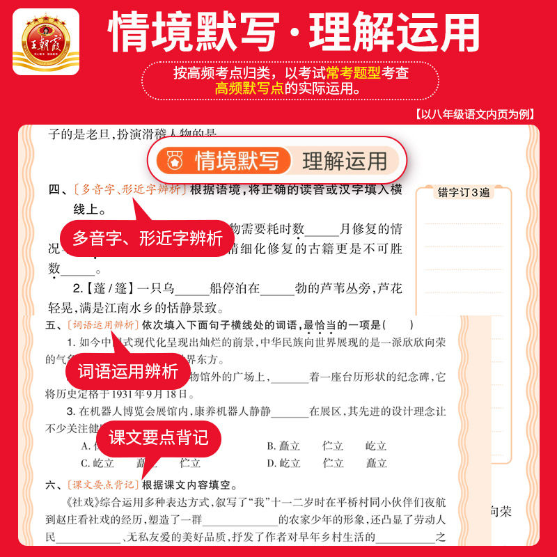 2026春王朝霞活页初中数学、语文、英语、生物、政治、历史、地理默写与计算全套人教版同步练习册,涵盖七年级下册至九年级上下册内容,紧扣新课标与人教版教材,系统梳理基础知识,强化重点难点。活页设计灵活便捷,便于拆分使用与复习整理。题型丰富,包含默写、计算、综合训练等,注重知识巩固与能力提升,适合初中各年级学生同步学习与考前复习。精选必刷题,梯度合理,帮助夯实基础、突破瓶颈,是提升学科素养的高效学习工具,助力学生稳步提分,轻松应对中考。