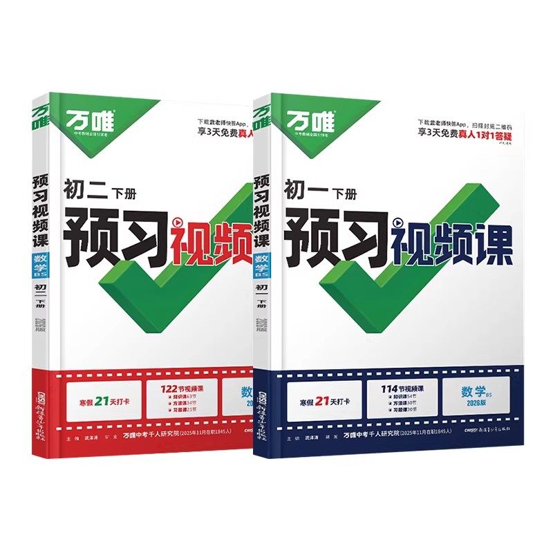 2026春万唯中考初中预习视频课,专为七、八年级学生寒假预习打造,涵盖语文、数学、英语、政治、历史、生物、地理七科(含“小四门”),同步北师大版、人教版教材。课程由一线名师精讲,紧扣新课标与中考考点,帮助学生夯实基础、提前适应下册内容。配套同步练习册,讲练结合,巩固知识点,提升学习效率。视频课支持反复观看,灵活安排学习时间,是寒假高效预习的理想选择。万唯专注中考研究多年,品质保障,助力学生赢在新学期起点。