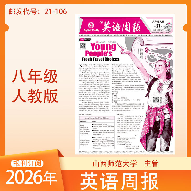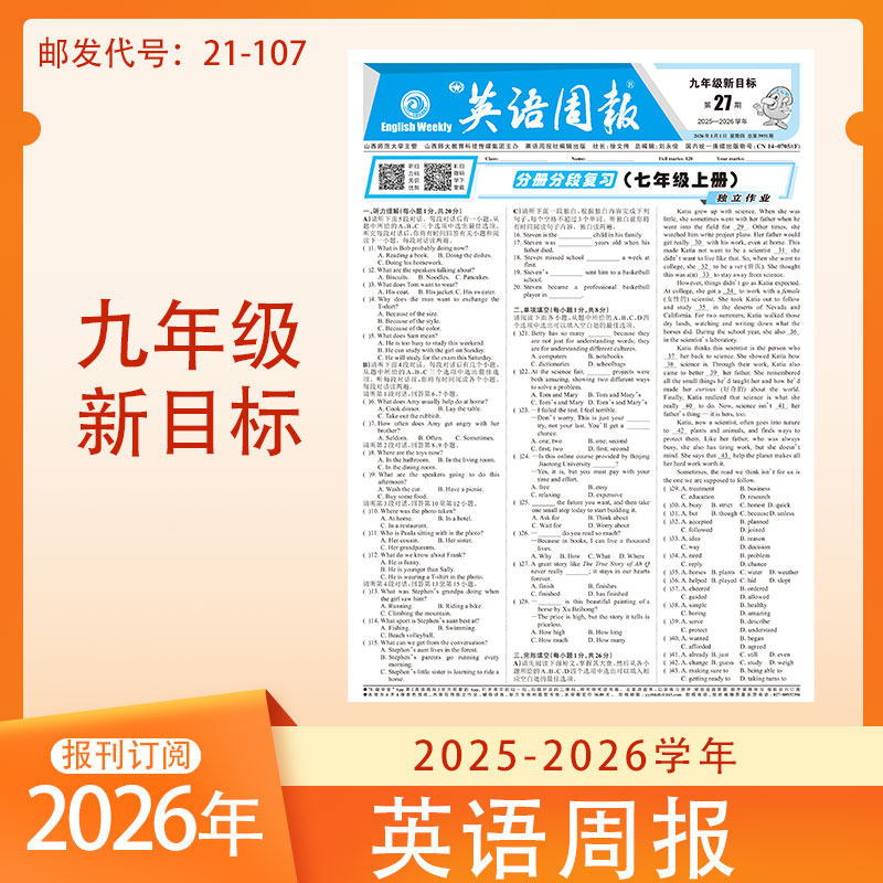 《英语周报》七八九年级(25-26学年下册)江西人教版,专为初中生设计,紧扣教材同步内容,系统梳理核心词汇、重点语法与高频单词。报纸以单元为单位,结合课本知识点,设置词汇精讲、语法点拨、句型归纳等栏目,帮助学生夯实基础、提升综合运用能力。内容贴近江西地区教学实际,题型丰富,配有典型例题与同步练习,兼顾听说读写训练。每期附赠听力材料及答案解析,便于学生自测与巩固。作为权威英语学习辅导报,《英语周报》助力学生高效掌握课内知识,稳步提升英语成绩,是师生信赖的优质学习资源。