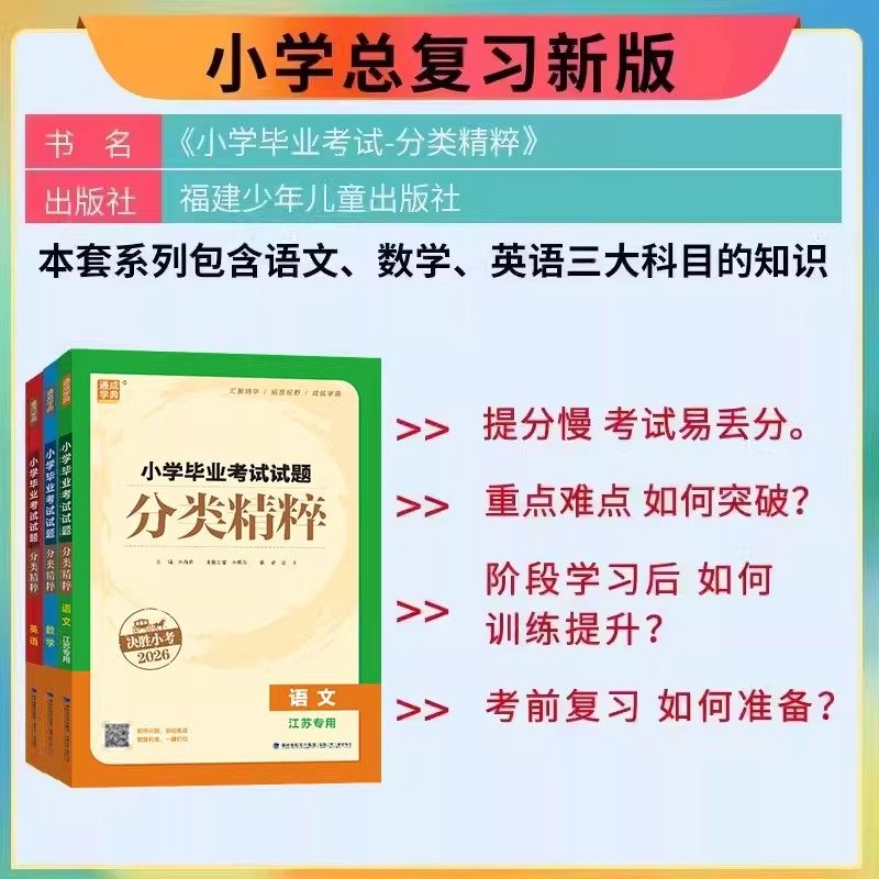 《2026小学毕业考试试卷精编分类精粹》(江苏版)专为六年级学生小升初备考设计,涵盖语文、数学、英语三科,紧扣江苏地区最新课标与考纲。本书精选历年真题与典型题型,按知识点分类编排,强化专项训练,帮助学生系统梳理重点难点。每科配备多套全真模拟试卷,题型全面、难度适中,有效提升应试能力。内容编排科学,讲练结合,附详细解析,便于自查自纠。由新华正版发行,权威可靠,是小学总复习阶段不可或缺的优质教辅资料,助力学生高效备考,冲刺理想中学。