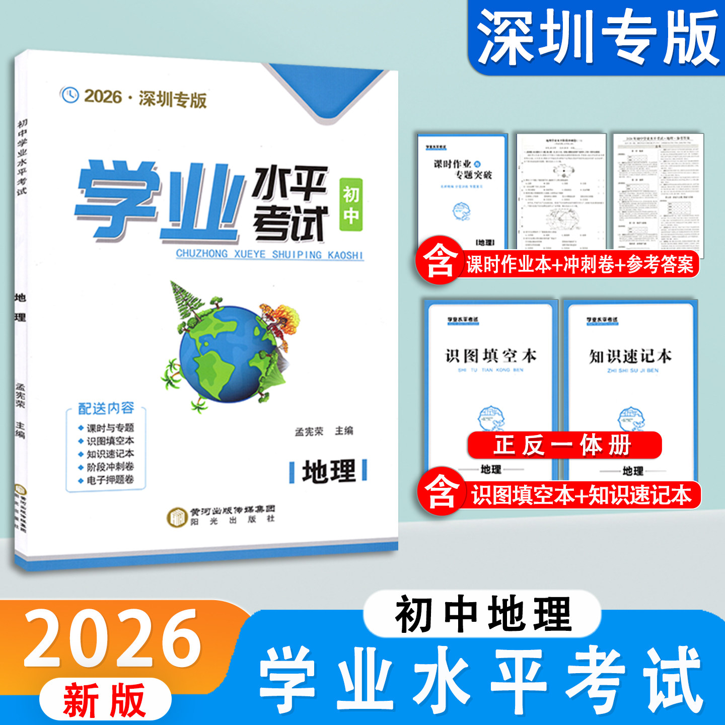 2026新版《深圳专版学业水平考试初中生物地理复习用书》专为七、八年级学生量身打造,紧扣深圳本地考纲与教材,内容精准对接学业水平考试要求。本书涵盖生物、地理两科核心知识点,配备知识速记本帮助高效记忆,识图填空本强化地图与图像理解,课时作业本巩固课堂所学,综合试卷提升应试能力,并附详细答案册便于自查自纠。结构清晰、题型丰富,讲练结合,助力学生夯实基础、突破重点难点,是深圳初中生备战学业水平考试的理想复习资料。