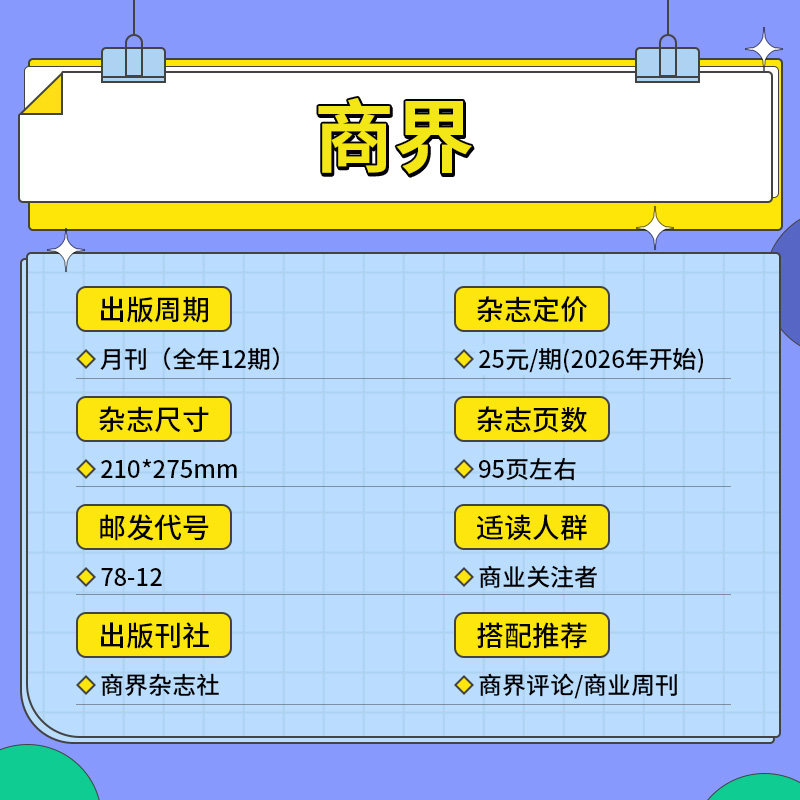 【全年订阅】《商界》杂志2026年1月起订,每月一期,快递直送家门,邮发代号78-12。聚焦商业前沿动态,深度解析财经热点,助力读者把握市场脉搏、提升商业洞察力。除2026年外,另提供2025、2024、2023、2022年等往期全年或半年订阅服务,起订月份灵活可选,满足不同阅读需求。商界旗舰店品质保障,正版授权,订阅便捷。无论是投资决策、创业指导,还是企业管理与行业趋势,《商界》均为您提供权威、实用的商业资讯。立即订阅,开启智慧商业之旅,掌握未来先机。