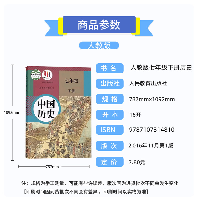 人教版初中七年级《中国历史》全套共两册,分别为七年级上册和下册,由人民教育出版社出版,是义务教育阶段七年级(即初中一年级)学生使用的统编历史教材。上册主要讲述中国古代史,从远古时期至魏晋南北朝,涵盖中华文明的起源、早期国家发展及民族融合等内容;下册聚焦隋唐至明清时期,重点介绍统一多民族国家的巩固与发展、科技文化成就及对外交流。教材内容严谨、图文并茂,注重历史时序与核心素养培养,配有丰富的史料、地图和思考题,帮助学生建立正确的历史观,增强文化自信,是初中生系统学习中国历史的重要课本。