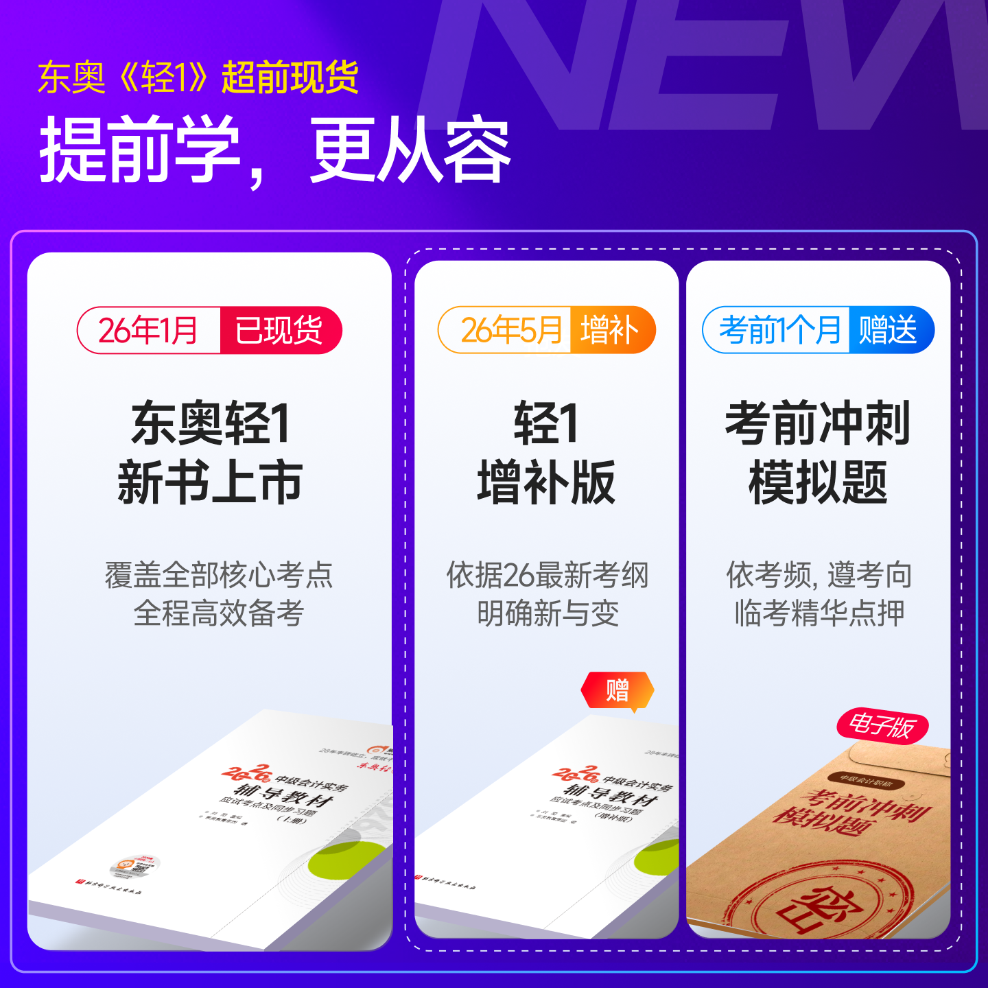 2026年东奥新版《中级会计职称考试辅导教材·轻松过关1》(轻一)官方全套,紧扣最新考试大纲,涵盖《中级会计实务》《财务管理》《经济法》三科,由权威名师张志凤等倾力编写。丛书系统梳理核心考点,搭配经典例题与解析,帮助考生高效掌握重难点。配套2025年中级会计师历年真题试卷及高质量题库,强化实战训练,提升应试能力。轻一以“讲练结合、重点突出”著称,是广大考生备考中级会计职称的首选辅导资料,助力考生轻松过关,顺利取证。