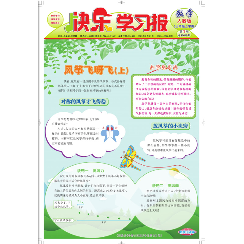 这款商品为“快乐学习报”,订阅期限为半年,包含完整的24期内容,面向小学生,聚焦于数学学科教学。这份报纸适合1-6年级的小学生使用,包括上册和下册内容。它结合人教版、苏教版和北师大版教材,注重课外阅读与新闻时事期刊的结合。通过订阅这份报纸,孩子们可以扩大阅读面,提升数学能力,同时了解时事新闻,培养综合素质。这款商品旨在帮助孩子们快乐学习,提升知识水平和思维能力。