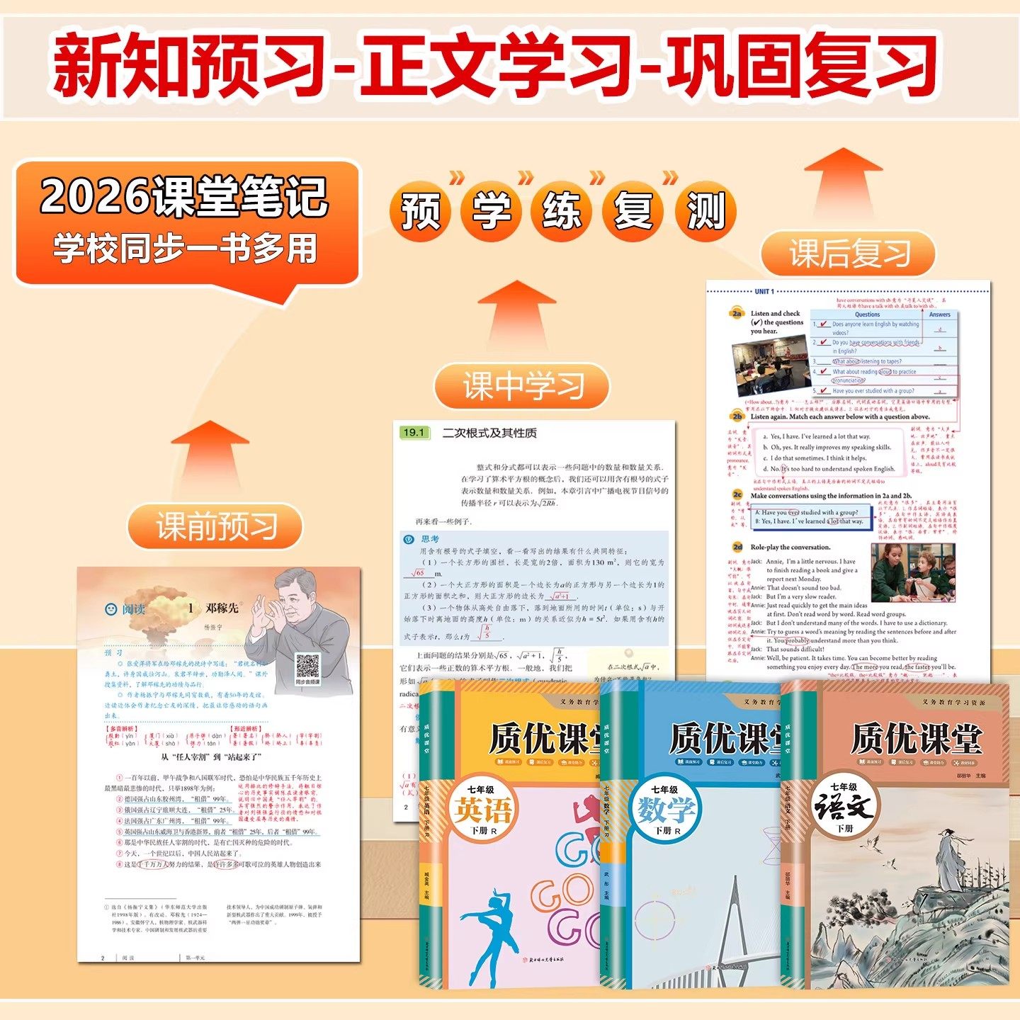 2026新版人教版《课堂笔记》涵盖七至九年级语文、数学、英语、物理、化学、历史、政治、地理、生物全学科,同步教材原文,紧扣课标要求。内容由一线名师与学霸经验结合编写,系统梳理知识点、重难点、考点及解题技巧,配有典型例题与易错警示。上册下册分册设计,结构清晰,图文结合,便于预习、复习与课堂巩固。不仅还原教材精髓,更提供高效学习方法,助力初一至初三学生夯实基础、提升成绩,是学生自主学习、教师教学参考的理想工具书,真正实现“一书在手,学习无忧”。
