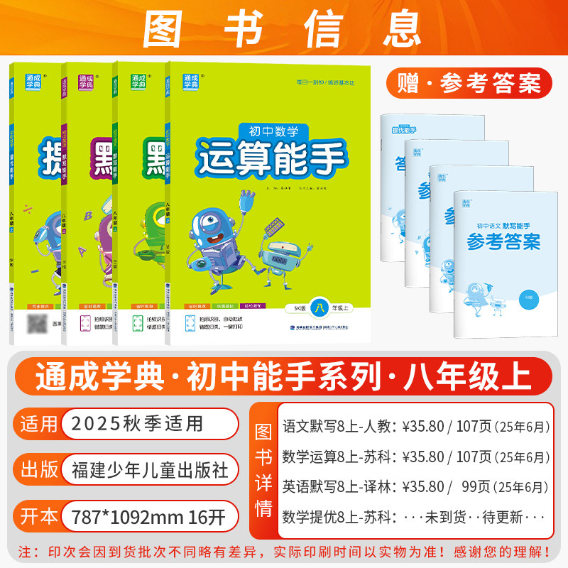 《2026春江苏版初中运算默写计算能手》及《提优诵读能手》系列,专为七至九年级学生设计,覆盖语文、数学、英语、道德与法治、历史等学科,分上下册同步教材。丛书紧扣江苏中考要求,以“每日一刻钟”为核心理念,通过精准默写、运算训练与诵读积累,夯实基础知识,提升学科素养。内容编排科学,题型多样,注重基础与提优结合,帮助学生高效巩固课堂所学,培养良好学习习惯。配套“通成学典”品牌优质资源,是初中生日常练习、考前复习的理想助学工具,助力学生在初中阶段稳步提升,练好基本功,迈向学业新高度。