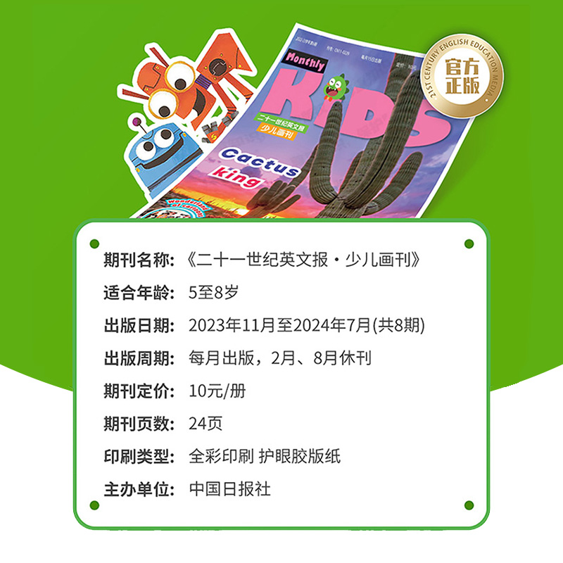 【少儿画刊】21世纪英语报是一本专为少儿打造的英语画报,内容涵盖新闻时事、阅读理解、词汇学习等方面。该报适合年龄在7-12岁的儿童阅读,旨在提高孩子们的英语水平和国际视野。该报提供全年和春秋学期订阅服务,同时也有过期报纸供读者回顾和学习。对于想要提高孩子英语能力和知识的家长和教育工作者来说,【少儿画刊】是一本不可错过的优秀读物。限时优惠订阅,赶快行动吧!