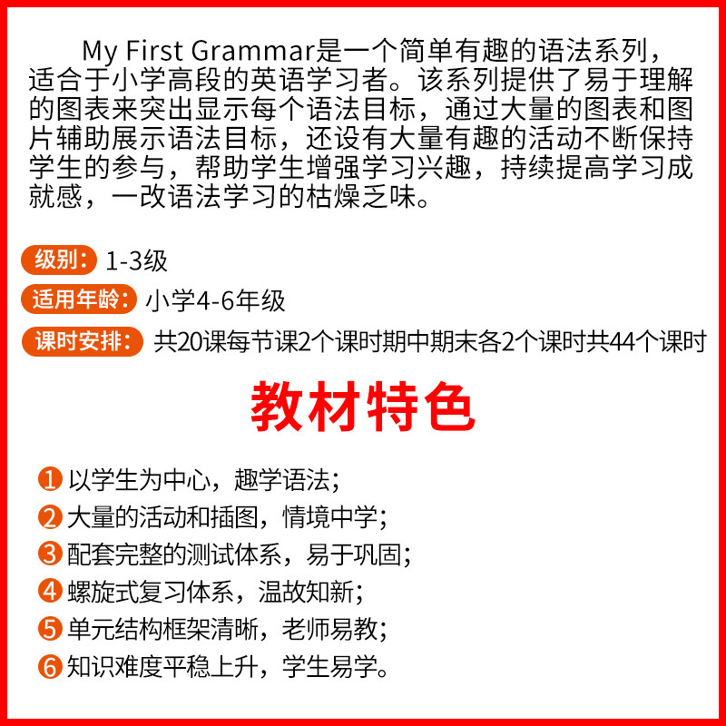 《My First Grammar 1-2-3级》新版少儿小学寒暑假短期英语语法教材,专为6-12岁小学生设计,紧扣新课标要求,内容系统、趣味性强。教材分三级递进,由浅入深讲解基础语法点,搭配生动插图、情景对话和互动练习,帮助孩子在假期高效巩固语法知识。每单元设置“语法小课堂”“趣味练习”“闯关挑战”等环节,激发学习兴趣,提升语言运用能力。配套音频支持听力训练,适合寒暑假短期集中学习或课后补充。本教材注重实用性与趣味性结合,让孩子在轻松氛围中掌握核心语法,为英语学习打下坚实基础。