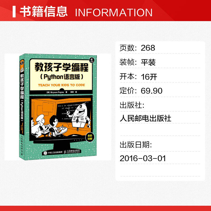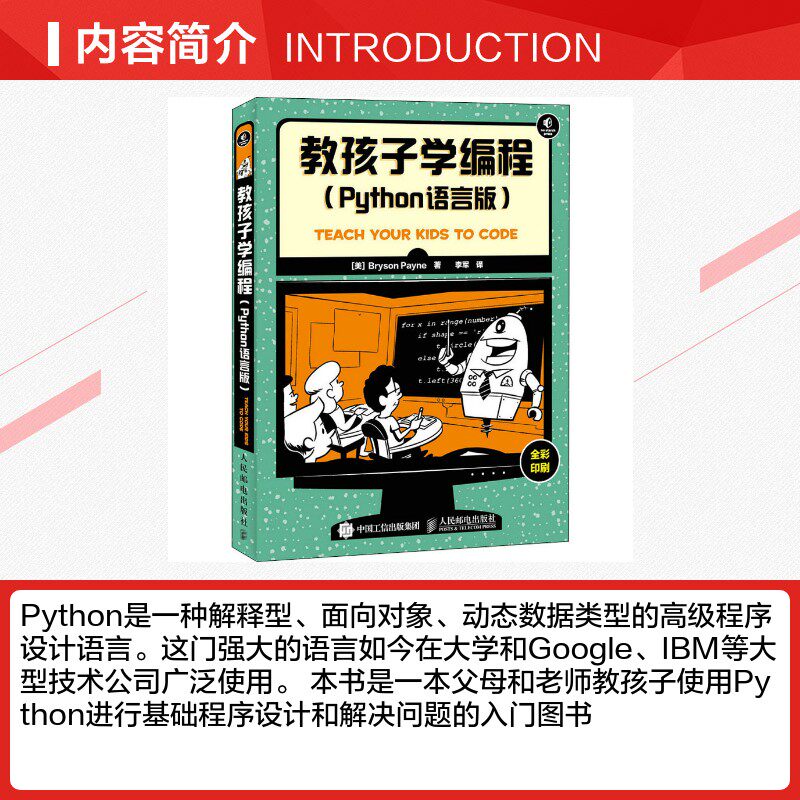 《Python编程入门(全彩印刷少儿版)》是一本专为青少年设计的编程启蒙图书,采用生动活泼的语言和丰富的全彩插图,帮助孩子轻松掌握Python语言基础。书中从变量、循环、条件判断等核心概念讲起,结合趣味项目如小游戏、图形绘制等,让孩子在实践中学习编程思维。内容循序渐进,配有大量示例代码和动手练习,适合零基础学生自学或课堂教学使用。本书注重培养逻辑思维与创造力,是孩子迈入计算机编程世界的第一本理想教程,助力他们在数字时代赢在起跑线。