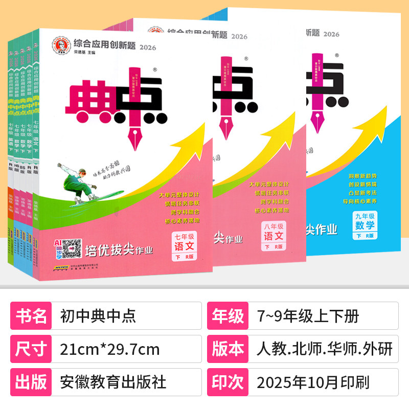 《典中点》是荣德基教育集团推出的经典同步练习丛书,涵盖七至九年级主要学科。本套资料包括七年级至八年级语文、英语(人教版、外研版),九年级物理(教科版)、化学(鲁教版),以及七年级数学(北师大版BS、华师大版)等全一册内容。题目设计紧扣教材,注重基础巩固与能力提升,题型多样,梯度合理,配有详细解析,帮助学生夯实基础、突破难点。作为同步练习册,《典中点》既适合课堂随堂训练,也适用于课后复习与自主学习,是广大师生广泛认可的高效学习辅助工具,助力学生稳步提升学业成绩。