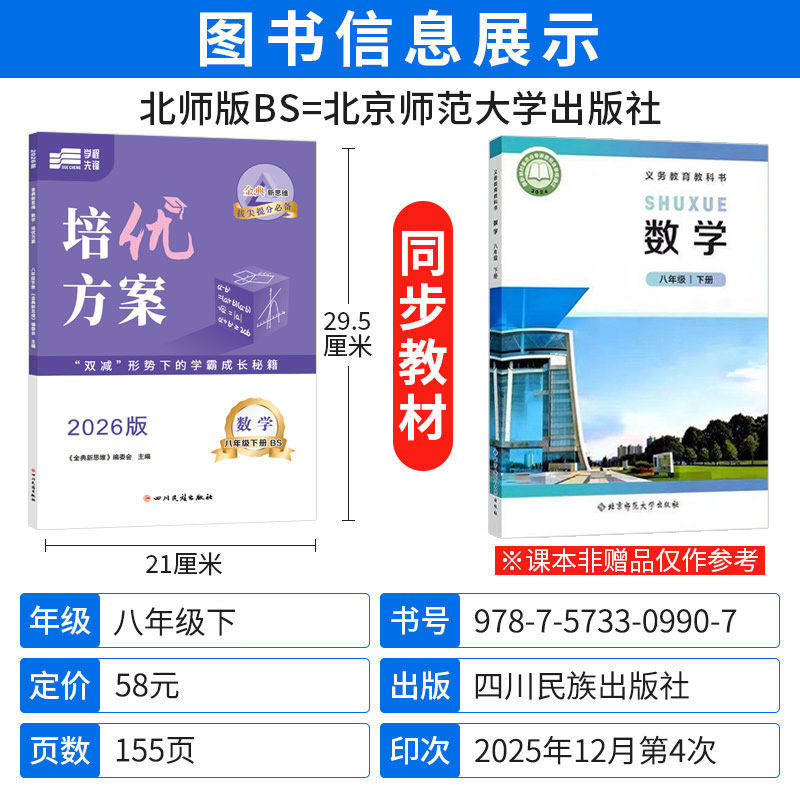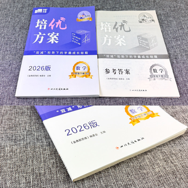 《2026春金典新思维培优方案·八年级下册数学(北师大版)》专为初二学生设计,紧扣教材重难点,系统梳理知识体系。本书精选典型例题,设置专题训练,强化解题思维与方法,帮助学生突破几何证明、函数应用、数据分析等核心难点。配套期中期末检测试卷,模拟真实考试情境,提升应试能力。题型丰富,梯度合理,兼顾基础巩固与能力提升,适合课堂同步学习与课后培优使用。作为权威教辅资料,本书融合北师大版教材特色,助力学生夯实基础、拓展思维,稳步提高数学成绩,是八年级学生高效复习与提升的优质选择。