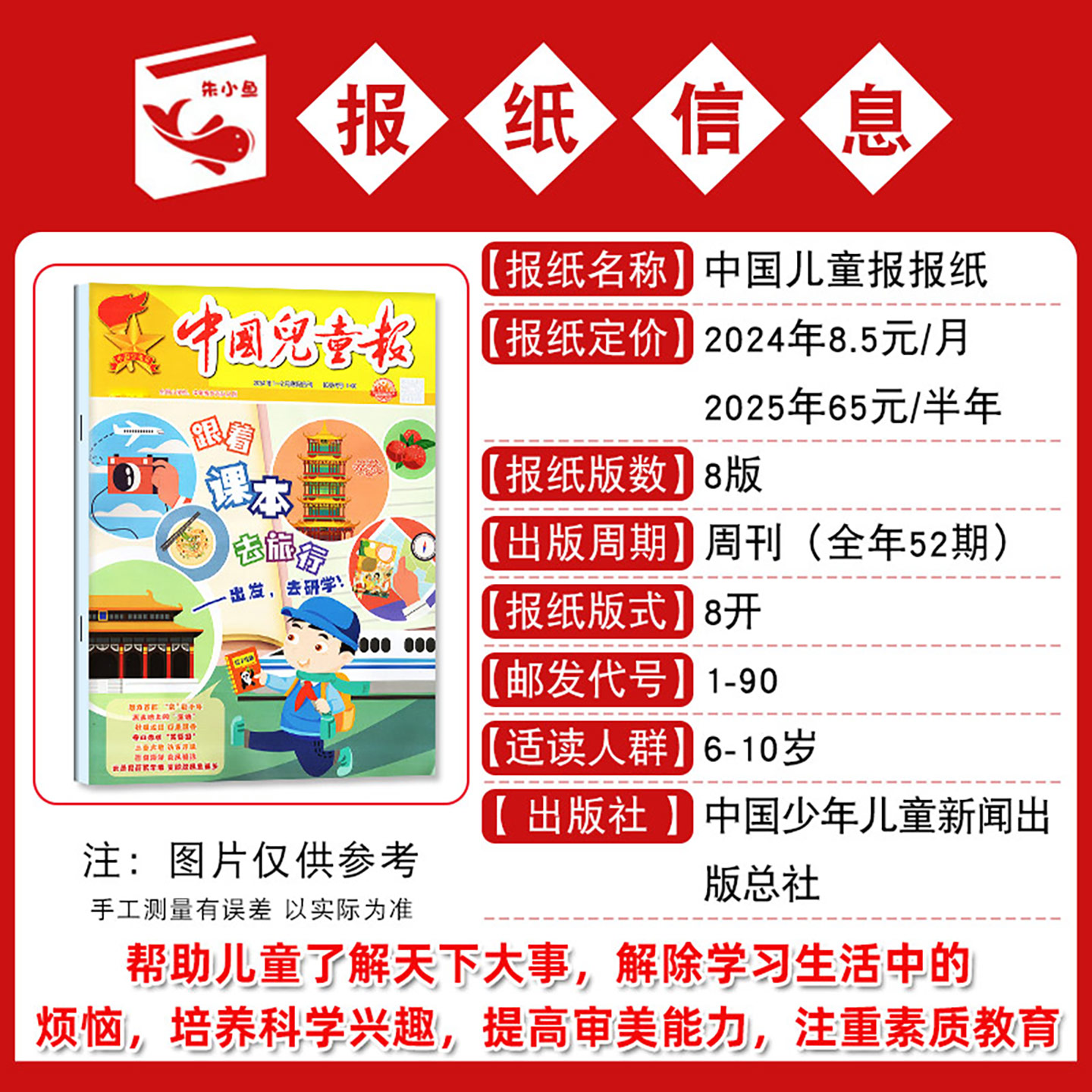 中国儿童报是一份面向小学低年级学生的报纸杂志,适用于6-10岁儿童。该报纸注重活动探索、作文写作素材以及兴趣阅读方面的内容的提供,内容新鲜有趣,符合孩子们的口味。订阅时间为一年,自2025年1月至12月,非过刊。对于家长来说,这是一份很好的阅读材料,可以让孩子在轻松愉快的氛围中增长知识,培养兴趣爱好。无论是作为日常读物还是学习资料,中国儿童报都是孩子们的理想选择。
