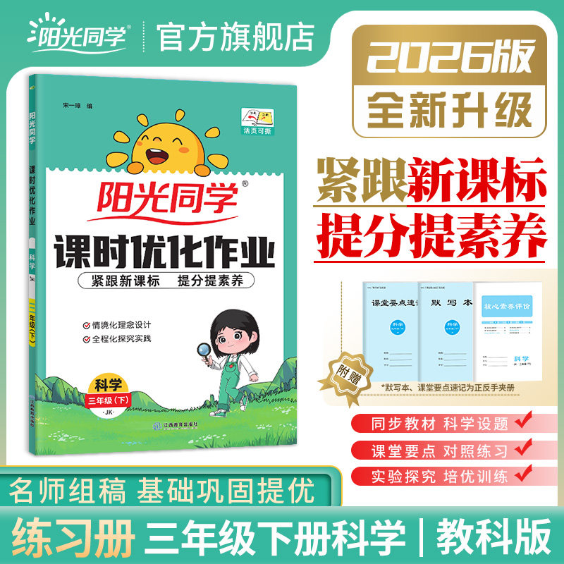 《2026春阳光同学课时优化作业本·科学》(教科版)专为小学三至六年级学生设计,涵盖上下册内容,严格同步浙江地区科学教材。本书紧扣课程标准,每课时设置基础巩固、能力提升和拓展探究三大模块,题型丰富,梯度合理,注重实践与思维训练。通过精选习题帮助学生夯实基础知识,提升科学素养与解决问题的能力。内容编排科学严谨,配有清晰解析,便于学生自主学习及教师课堂检测。适用于日常练习、课后复习与阶段性测评,是提升科学成绩的高效提优训练册,助力学生在探究中成长,在练习中进步。