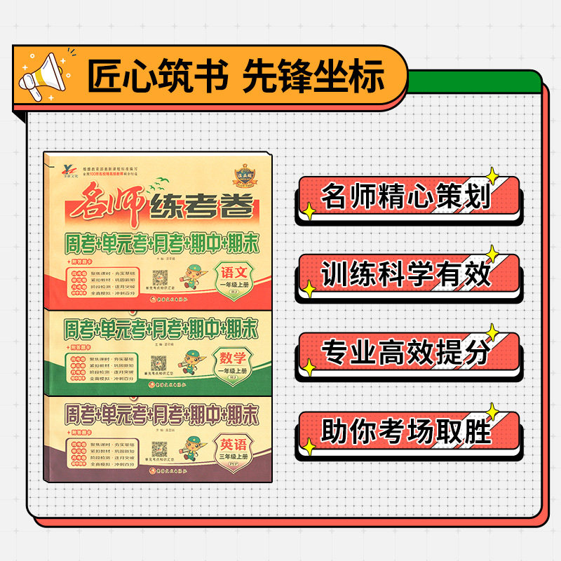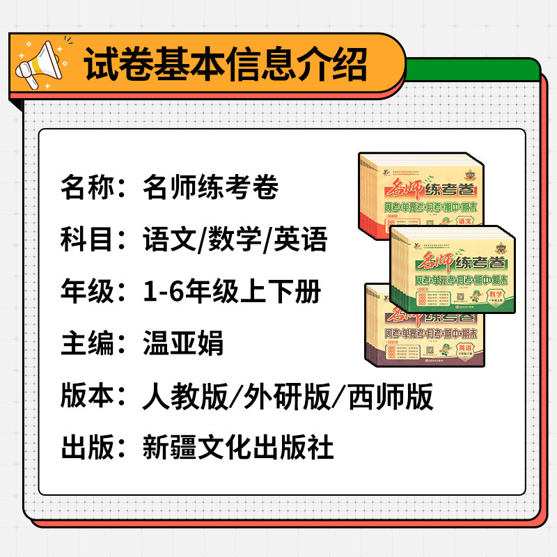 《名师练考卷》是一套专为小学一至六年级学生设计的同步练习与测评资料,涵盖语文、数学、英语三科,适配人教版、西师版、北师大版、外研版等多种教材版本。试卷包含单元测试、周考、月考、期中、期末及专项训练等多种题型,紧扣教学大纲,注重基础知识巩固与能力拓展。题目由一线名师精心编写,难度适中,题型灵活,帮助学生及时查漏补缺,提升综合应试能力。无论是日常练习还是阶段性复习,都能有效助力学生夯实基础、稳步提分,是家长辅导、教师检测和学生自测的理想选择。