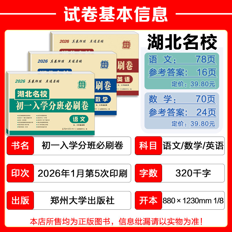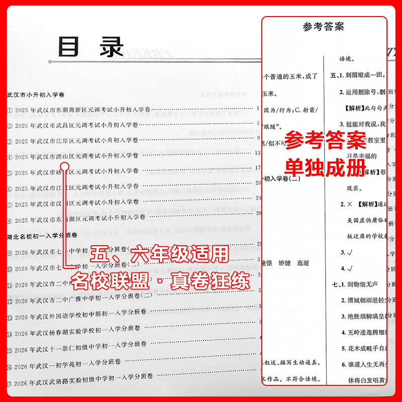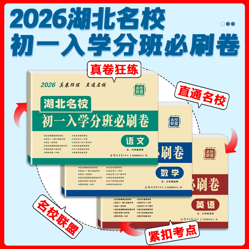 《湖北名校初一入学分班必刷卷》专为五、六年级毕业生设计,紧扣人教版教材,覆盖语文、数学、英语三科核心知识点。试卷精选武汉市小升初真题及名校分班考试高频题型,注重基础巩固与能力提升并重,题型灵活、难度适中,精准对接初中入学分班考要求。内含专项训练、综合模拟及押题卷,帮助学生系统复习、查漏补缺,快速适应初中学习节奏。作为武汉市小学毕业必刷题总复习资料,本试卷由一线名师编审,考点覆盖全面,解析详尽,是冲刺名校分班考的高效备考利器,助力学生赢在初中起点。