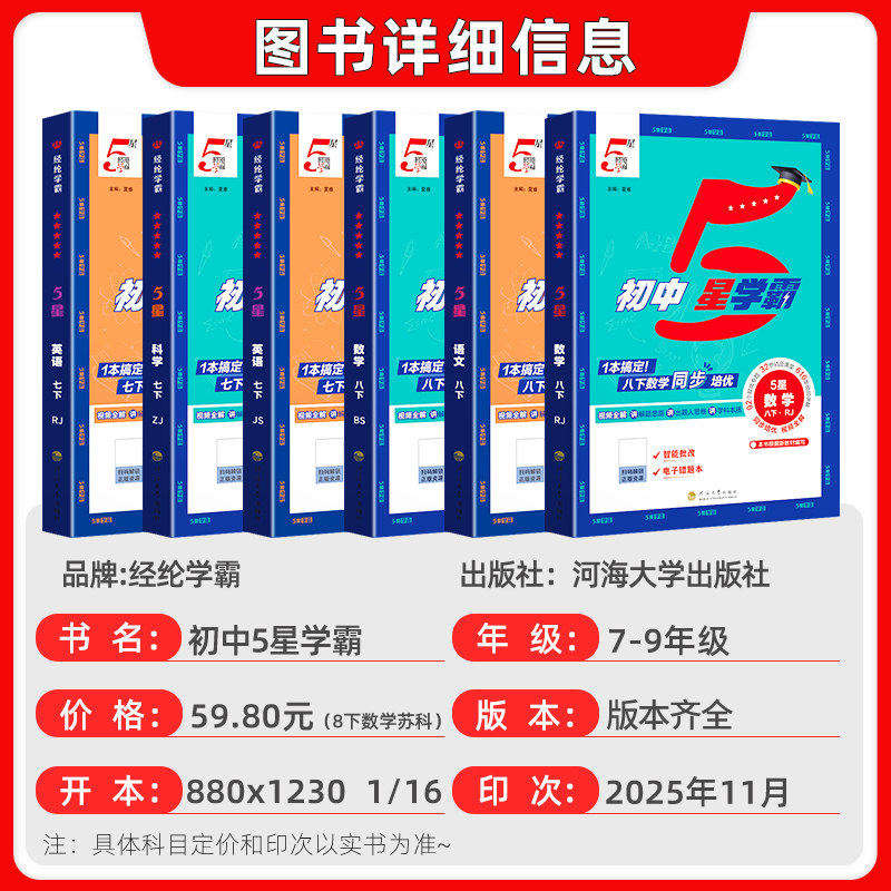 2026春《经纶初中5星学霸·题中题》系列,专为七至九年级学生打造,覆盖语文、数学、英语、科学、物理等学科,同步人教版、北师大版、浙教版、江苏版等主流教材。丛书紧扣新课标,系统梳理初一二三上下册核心知识点,精选典型例题与分层练习题,注重基础巩固与能力提升并重。题目设计由浅入深,突出重难点突破,辅以详细解析,帮助学生高效掌握解题思路。结合中考趋势,强化综合应用与思维训练,是学生夯实基础、冲刺高分的优质同步训练资料,助力学子成为真正的“五星学霸”。