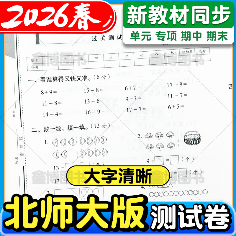 2026春新版北师大版小学数学试卷,涵盖一年级至六年级上下册,严格依据北师大版新教材编写,与课堂教学同步。试卷包含单元测试卷、专项练习及期末冲刺100分模拟卷,题型丰富、难度适中,注重基础知识巩固与思维能力拓展。每套试卷紧扣新课标要求,突出重难点,帮助学生及时查漏补缺,提升解题技巧。答案详解清晰,便于家长辅导和教师讲评。全套试卷设计科学,循序渐进,助力学生在学期各阶段稳步提升,冲刺满分目标,是小学生数学学习的优质配套练习材料。