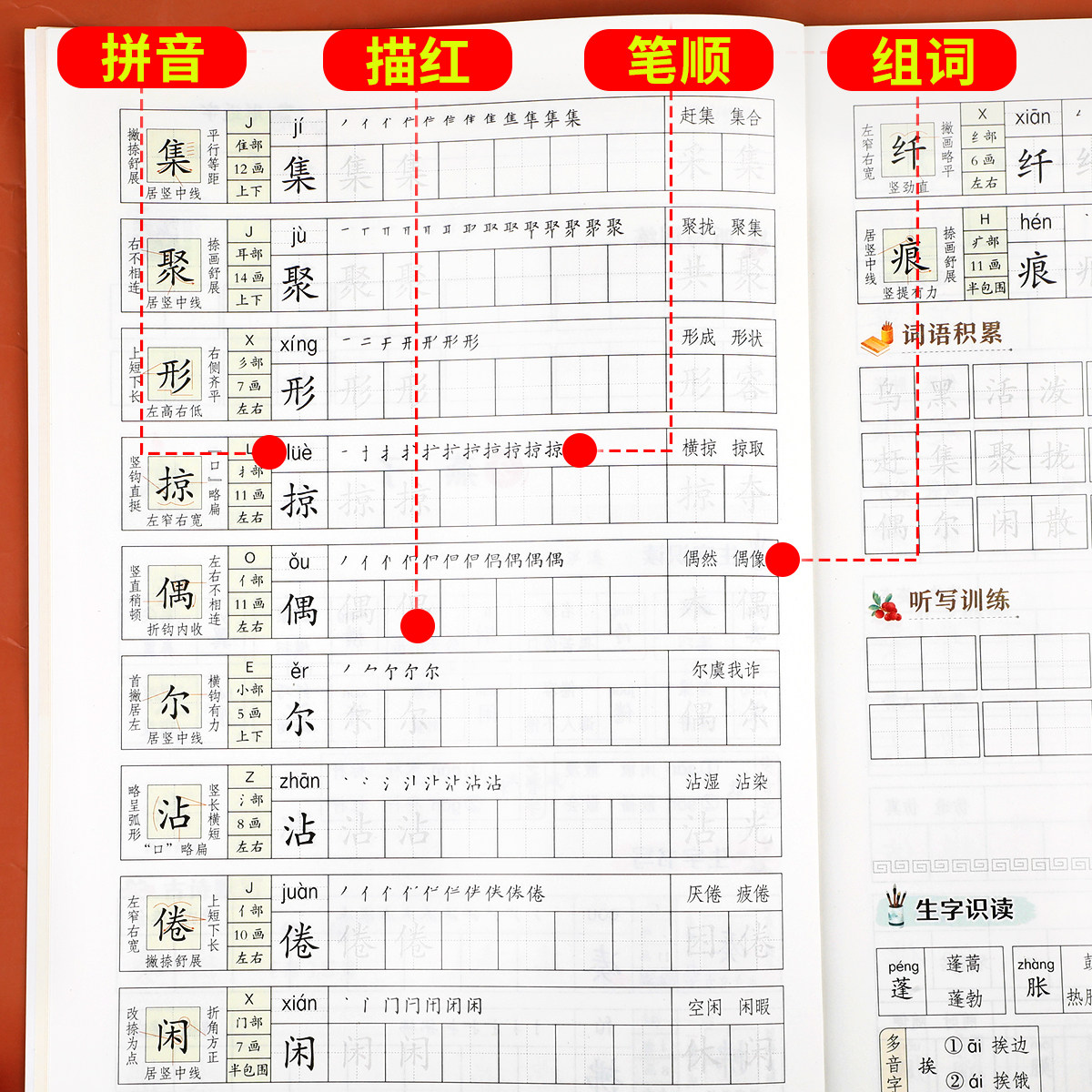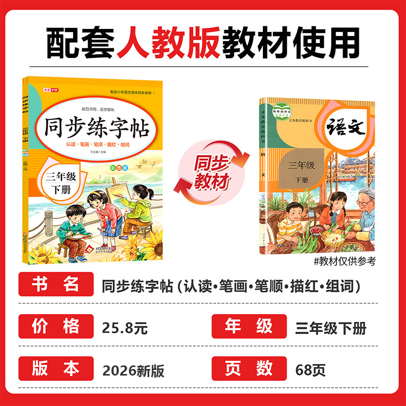 【老师推荐】三年级下册练字帖(人教版)专为小学三年级学生设计,与语文课本同步,紧扣教材生字、词语及课文内容,帮助学生巩固课堂所学。字帖采用规范楷书范字,笔画清晰、结构匀称,适合初学者临摹。每日一练设计,循序渐进提升书写能力,培养良好写字习惯。内页预留充足练习空间,支持钢笔书写,纸张厚实不透墨,使用体验佳。课课练模式与教学进度同步,便于课后巩固与预习,是老师和家长公认的优质练字工具,助力孩子写一手漂亮字,夯实语文基础。