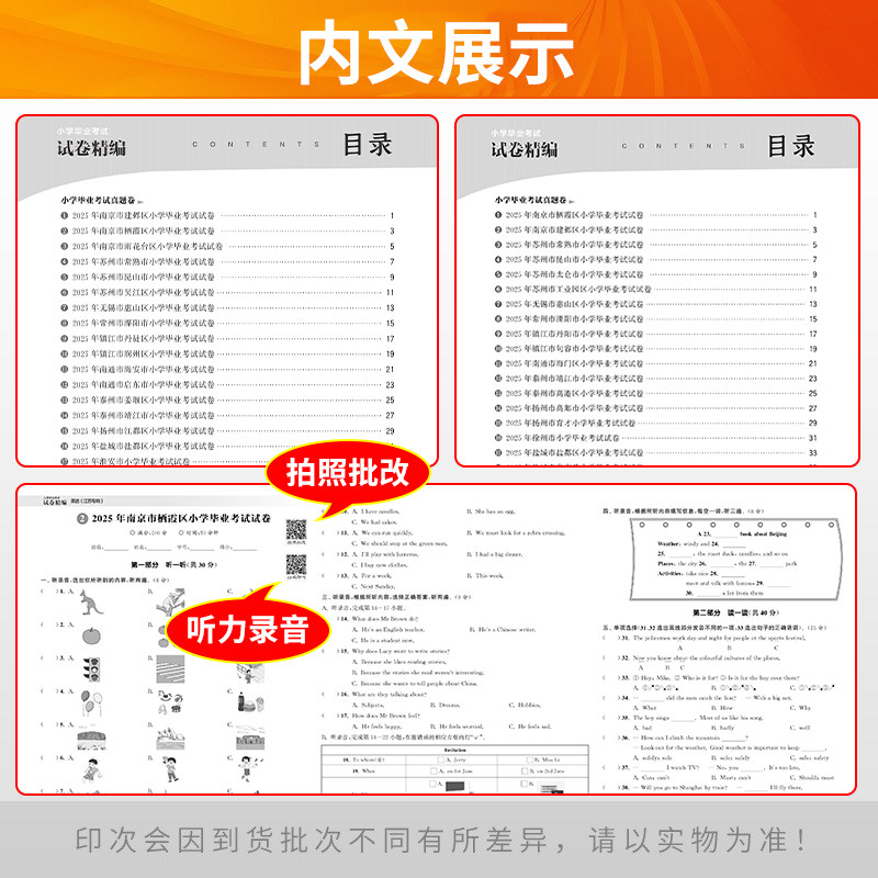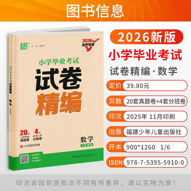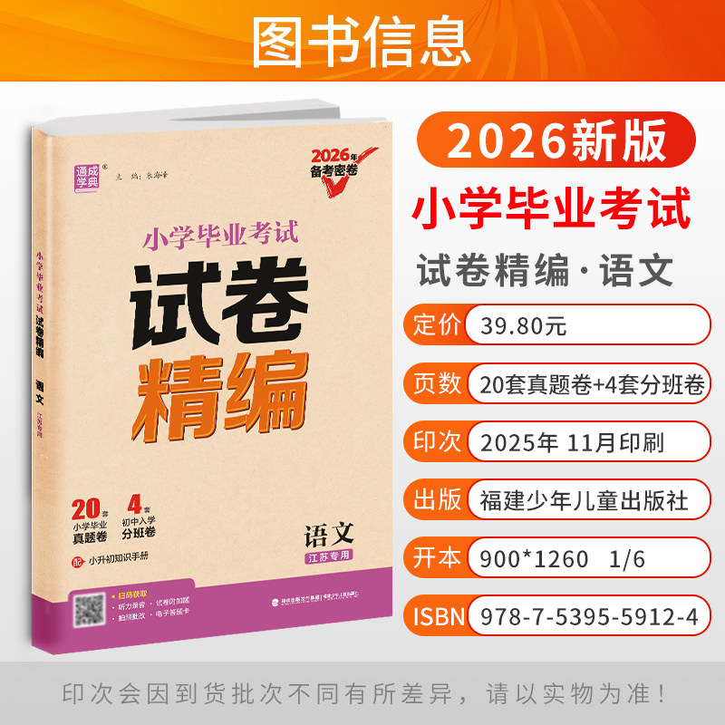 《2026新版小学毕业考试试卷精编》(语文、数学、英语全3本)专为江苏六年级学生设计,紧扣最新课标与江苏小升初考情,精选历年真题与优质模拟题,系统覆盖语数英三科核心知识点。试卷题型全面,难度梯度合理,注重基础巩固与能力提升并重,帮助学生高效复习、查漏补缺。每册均含专项训练与综合模拟,配有详细解析,便于自学与家长辅导。作为“通城学典”系列经典教辅,本书是小升初总复习的必刷题库,助力学生夯实基础、冲刺高分,顺利衔接初中学习。