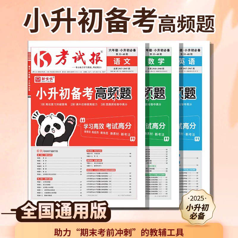 《2025秋新全优考试报·小升初备考高频题》专为六年级学生设计,涵盖语文、数学、英语三科,紧扣全国通用核心知识点,系统梳理小升初高频考点。本书精选典型例题,配备专项训练与期末冲刺试卷,强化基础、突破难点,助力学生高效复习。内容编排科学,题型贴近真题,注重能力培养与应试技巧提升,是小升初总复习的必备工具书。通过“必刷题”反复练习,查漏补缺,全面提升综合素养,为升学考试打下坚实基础,是家长信赖、学生必备的高效备考资料。