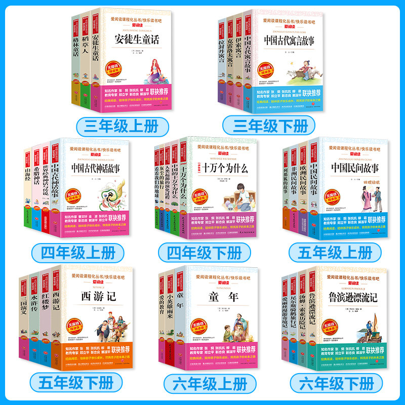 “快乐读书吧·爱阅读课程化丛书”是一套专为小学三至六年级学生设计的课外阅读指导丛书,涵盖《童年》《爱的教育》《十万个为什么》《鲁滨逊漂流记》《西游记》《山海经》《伊索寓言》及四大名著导读等经典作品。丛书结合语文课程标准,按年级分册编排,注重阅读兴趣培养与能力提升,通过导读、批注、思考与拓展练习,引导学生深度阅读、理解文本、积累语言。每册内容贴近学生认知水平,兼顾文学性、科学性与趣味性,助力学生养成良好阅读习惯,拓宽视野,提升综合素养,是课内外阅读衔接的理想读本。