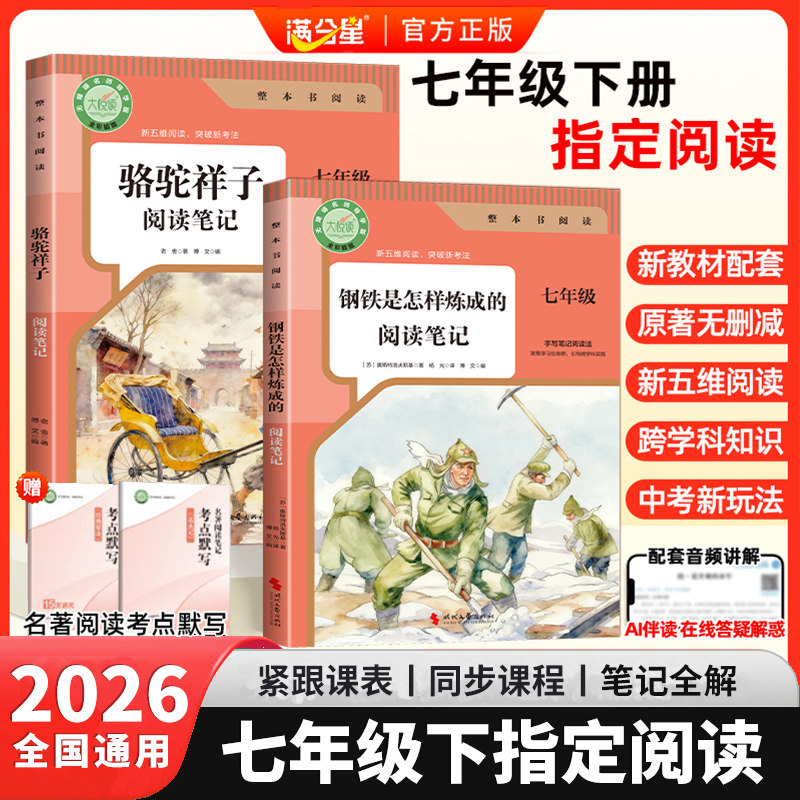 《骆驼祥子》与《钢铁是怎样炼成的》是七年级下册语文教材指定必读名著,均为正版原著完整版,无删减,严格配套人教版教学要求。老舍的《骆驼祥子》通过人力车夫祥子的悲惨命运,深刻揭示旧社会底层人民的苦难;奥斯特洛夫斯基的《钢铁是怎样炼成的》则以保尔·柯察金的成长历程,展现革命者的坚定信仰与顽强意志。两书语言生动,思想深刻,是提升阅读理解与写作能力的重要范本。本书附同步阅读笔记与考点解析,帮助学生把握人物形象、主题思想与艺术特色,助力中考名著备考,是初中生课外阅读与课堂学习的优质辅助资料。