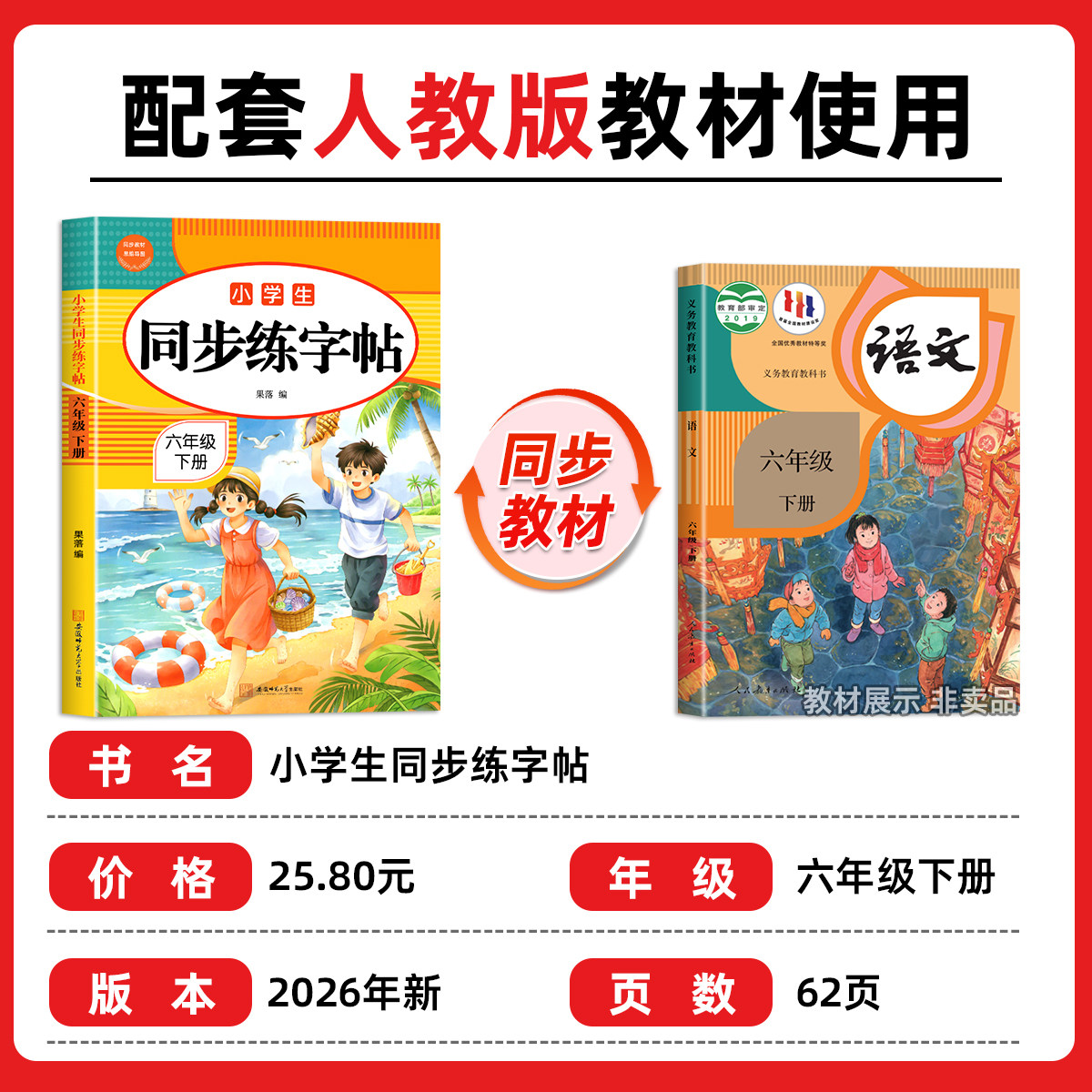 【2026新版】六年级下册练字帖(人教版)专为六年级下学期小学生设计,紧扣语文课本内容,同步生字、词语及课文重点,一课一练,帮助学生巩固知识的同时提升书写水平。字帖采用规范楷书字体,笔画清晰、结构严谨,适合钢笔书写,培养良好书写习惯。每日一练设计科学合理,循序渐进,强化记忆与书写能力。内页排版美观,留白充足,便于临摹与自主练习。是学生课前预习、课后复习、假期练字的理想辅助教材,助力语文学习与书写双提升。