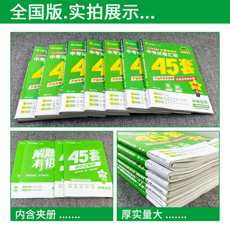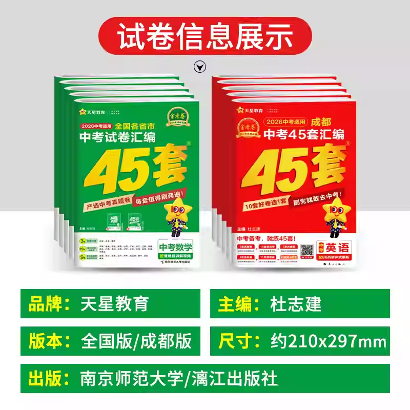 2026全国45套金考卷中考汇编真题试卷(语文、数学、英语、物理、化学、历史)由成都天星教育出品,专为初三总复习设计。本套试卷精选全国45套优质中考真题,涵盖九年级核心知识点,紧扣最新考纲,题型全面、难度适中,兼具基础巩固与能力提升功能。每科均配有详细解析,帮助学生精准把握命题规律,提升应试技巧。全国通用版本,适用于各地中考备考,是初三学生系统复习、查漏补缺、冲刺高分的理想资料。通过实战模拟训练,有效强化综合运用能力,助力中考取得优异成绩。