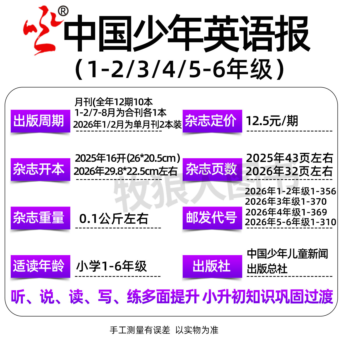 《中国少年英语报》全年珍藏版,涵盖2023–2025年1–12月刊,专为小学1–6年级学生精心打造。杂志按年级分册(1–2年级、3–4年级、5–6年级),内容紧贴课标,融合趣味故事、科普知识、文化拓展与实用表达,采用中英双语编排,助力孩子提升英语阅读力与跨文化素养。每期配有音频资源,支持扫码听读,适合课外自主学习或家庭共读。过刊打包优惠,知识不“过期”——经典内容历久弥新,是小学生巩固基础、拓展视野的理想读物,让英语学习轻松有趣、持之以恒。