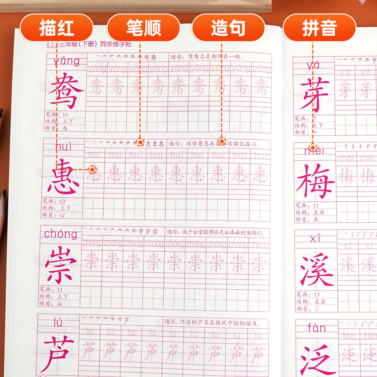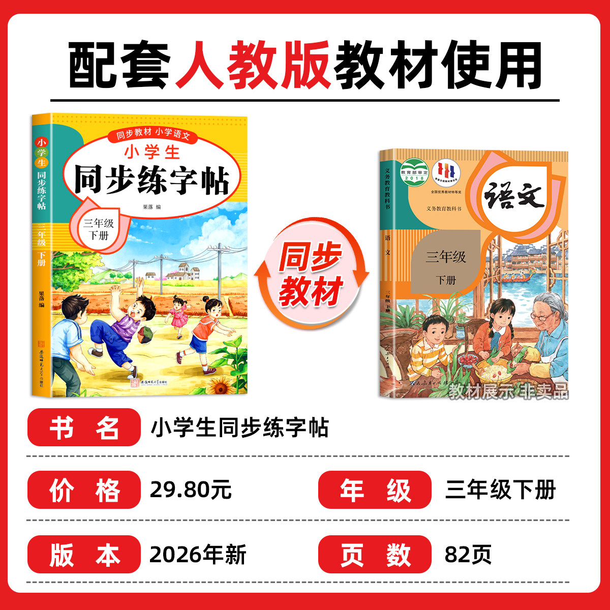 2026新版三年级下册练字帖(人教版)专为小学三年级学生设计,与人教版语文教材完全同步,涵盖下册全部生字、词语及重点句段。字帖采用规范楷书范字,笔画清晰、结构端正,帮助学生掌握正确书写要领。每课设置“每日一练”“课课练”模块,循序渐进提升书写能力。内页选用护眼纸张,搭配钢笔专用设计,适合日常课堂练习与家庭作业使用。通过系统临摹与反复练习,有效提高学生的书写速度、字形美观度和语文学习兴趣,是三年级学生夯实书写基础、养成良好写字习惯的理想辅助教材。
