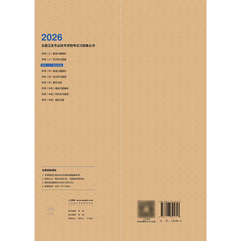 人卫版《2026药学士模拟试卷》是专为全国卫生专业技术资格初级药士(考试代码101)考生精心编写的高仿真复习资料,由人民卫生出版社旗舰店官方出版。本书紧扣最新考试大纲,涵盖药理学、药剂学、药物化学、药事管理等核心科目,题型全面、难度适中,贴近真实考试命题风格。每套模拟试卷均附有详细解析,帮助考生查漏补缺、掌握答题技巧。作为权威备考用书,本书由资深药学专家团队编审,内容科学严谨,是广大考生冲刺初级药士资格考试的理想选择,助力高效通关,提升职业竞争力。