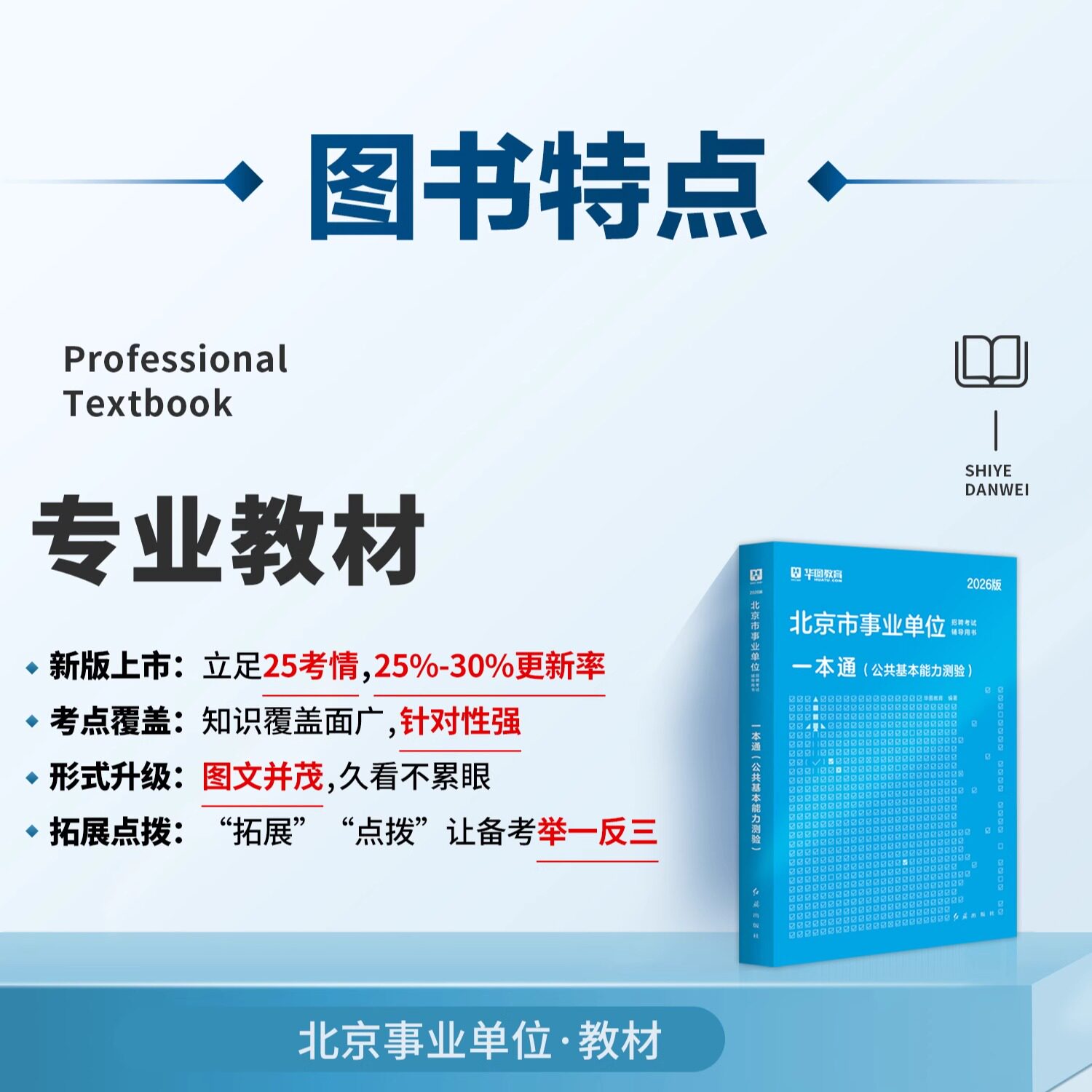 2026华图北京市事业编考试《公共基础知识综合能力测试》教材及真题试卷,专为报考北京市各区(如海淀、西城、东城、丰台、密云、平谷等)水务局及其他事业单位的考生精心编写。本书紧扣北京市事业单位公开招聘考试大纲,涵盖政治、法律、经济、管理、公文写作、科技人文、时政热点及北京地方知识等内容,系统梳理考点,强化综合能力训练。配套精选历年真题及高质量模拟卷,帮助考生熟悉题型、掌握答题技巧,提升应试水平。华图教研团队深度解析命题趋势,注重实战应用,是备考北京事业编公共基本能力测验的高效权威资料,助力考生顺利通过笔试,迈向理想岗位。
