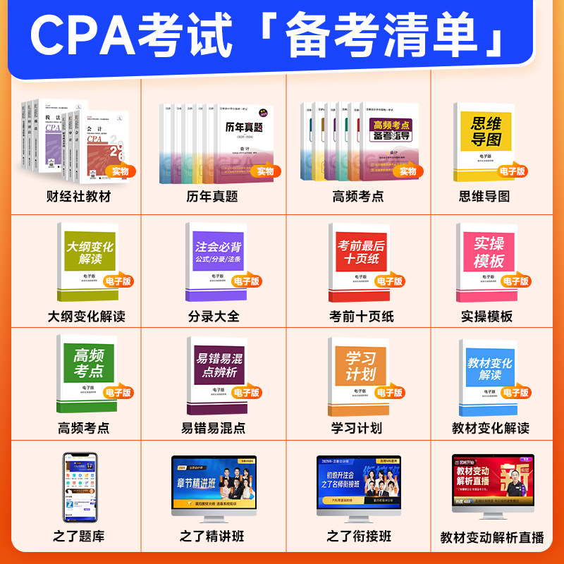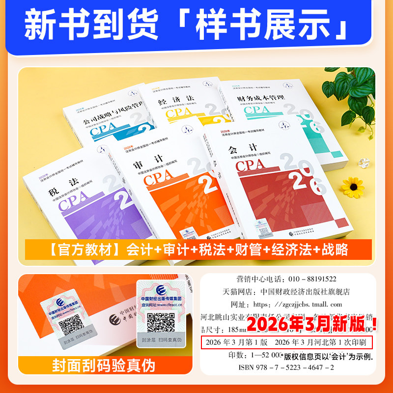 2026年新版注册会计师(CPA)官方教材及配套真题库全新上线,涵盖《会计》《审计》《税法》《经济法》《公司战略与风险管理》《财务成本管理》六科,内容紧扣最新考试大纲,权威准确。搭配东奥“轻松过关1”(轻一)习题集,系统梳理考点,强化实战训练;辅以财经社出版的精选练习题与历年真题解析,帮助考生精准把握命题趋势,提升应试能力。本套资料体系完整、重点突出,是备考2026年CPA考试的高效学习组合,助力考生夯实基础、突破难点,顺利通过考试。
