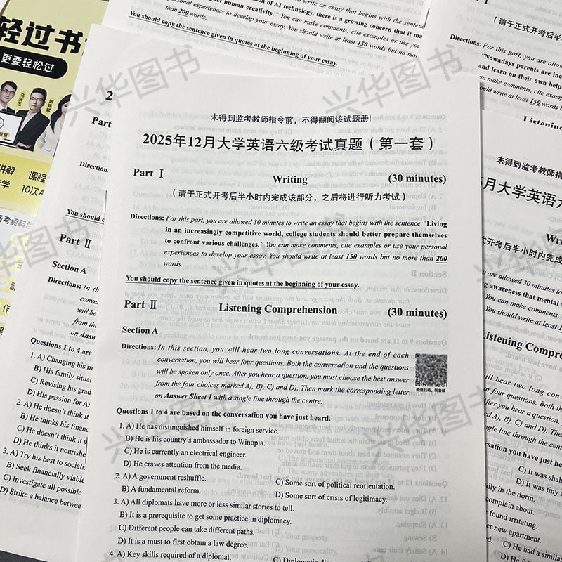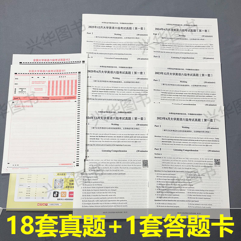 【含2025.12月真题纸质】黄皮书备考2026年6月大学英语六级考试四级真题真练CET-6,专为考生冲刺六级设计。本书收录近十年四级及六级历年真题,特别包含2025年12月最新真题(纸质版),紧扣最新命题趋势。试题解析详尽,涵盖听力、阅读、翻译与写作各模块,提供答题技巧与高频词汇总结。听力部分配备标准音频,支持扫码收听,强化实战训练。全真模拟排版,高度还原考场环境,帮助考生熟悉题型、提升应试能力。搭配黄皮书经典解析体系,是备战2026年6月CET-6的高效备考利器,助力考生稳步提分,顺利通过考试。