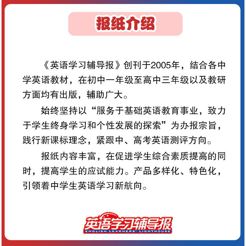 《英语学习辅导报》双语大阅读(2026年1月起订,全年订阅)专为小学至高中学生设计,涵盖小学、初中、高一至高三各年级,紧扣最新考纲与教材同步,助力学生夯实基础、提升阅读能力。报纸精选地道双语文章,题材丰富,难度分级科学,兼顾语言学习与应试需求。每期配有词汇解析、语法点拨及阅读训练,帮助学生拓展视野、积累表达。正版速发,确保时效性与权威性,是学生日常学习与备考的优质辅助资料。订阅全年,持续助力英语能力提升,轻松应对各类考试与实际应用。