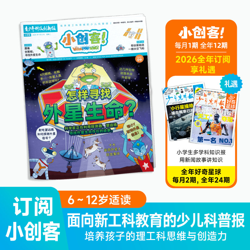 《小创客青少年科技创新报》(WhizzPopBang中文版)是专为6-12岁中小学生打造的科普百科报纸,融合趣味性与科学性,激发孩子探索世界的热情。每期内容涵盖前沿科技、自然奥秘、工程发明与创意实践,配以生动插图与互动实验,引导小读者动手尝试、动脑思考。报纸语言浅显易懂,兼顾知识深度与阅读趣味,助力培养科学思维与创新能力。2026年全年/半年订阅,让孩子每月收获新鲜科学灵感,在轻松阅读中成长为热爱探索的小创客。适合家庭共读与学校拓展,是提升科学素养的理想课外读物。