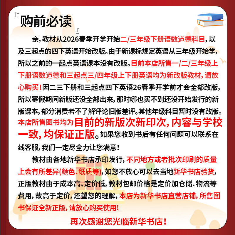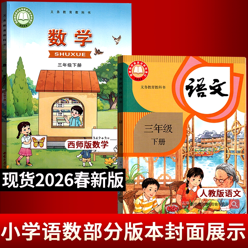 【26春季新改版】2026年新版小学三年级下册语文、数学、道德与法治教材已全面上市,涵盖人教版、北师大版、苏教版、西师大版等多个版本,适用于全国不同地区三年级下学期教学使用。本次改版严格依据最新课程标准,内容更贴近学生生活,注重核心素养培养,图文并茂,编排科学。语文强化阅读与表达,数学突出思维训练,道德与法治注重价值引领。所有教材均由新华书店正版发行,确保内容权威、印刷清晰,是师生教学、家长辅导的理想之选。欢迎广大师生及家长选购使用,助力孩子新学期学习进步。