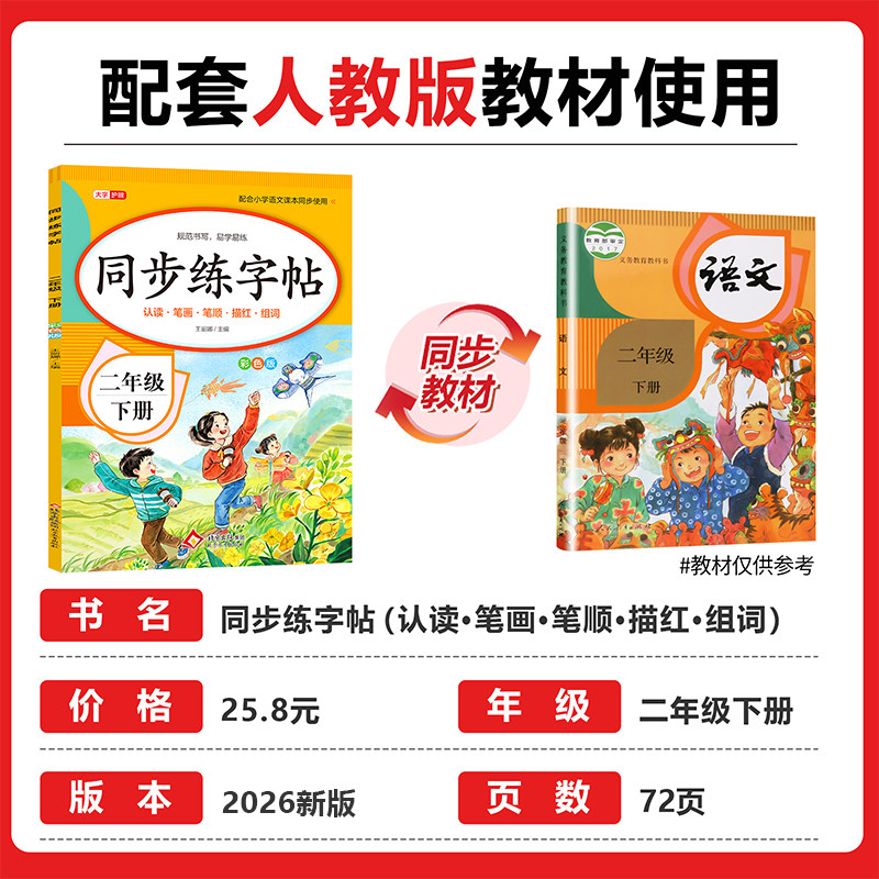2026新版二年级下册练字帖(人教版)专为小学二年级下学期学生设计,与语文课本同步,紧扣教材生字、词语及课文内容。字帖采用规范楷书字体,笔画清晰、结构端正,帮助学生掌握正确书写方法。每课设置“每日一练”和“课课练”板块,循序渐进提升书写能力。适配钢笔书写,纸张优质不透墨,保护孩子视力。通过系统练习,不仅能巩固课堂所学,还能培养良好的书写习惯和审美能力,是二年级学生夯实写字基础、提升语文素养的理想辅助教材。