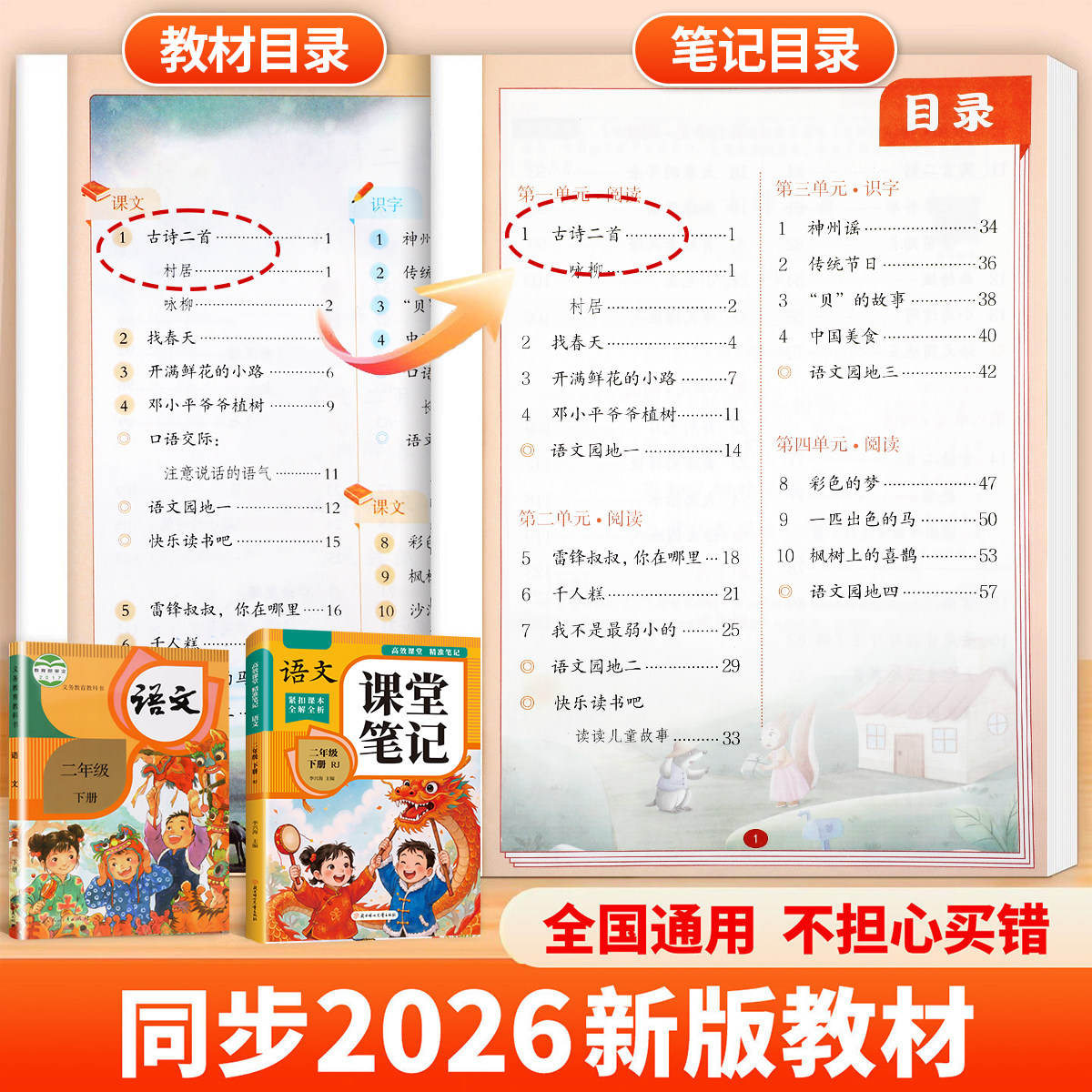 2026新版二年级下册课堂笔记(人教版)语文数学全套,专为小学二年级学生打造,紧扣教材内容,同步课本知识点。本书涵盖课前预习、课堂学习与课后复习全流程,帮助学生夯实基础、提升理解能力。语文部分注重字词积累、课文解析与阅读理解训练;数学部分梳理重点公式、解题思路与典型例题,搭配随堂练习巩固所学。内容编排科学,语言简洁易懂,配有清晰图解与重点标注,便于自主学习。正版教辅,品质保障,是家长辅导、学生自学的得力助手,助力孩子轻松掌握二年级下册核心知识,稳步提升学业成绩。