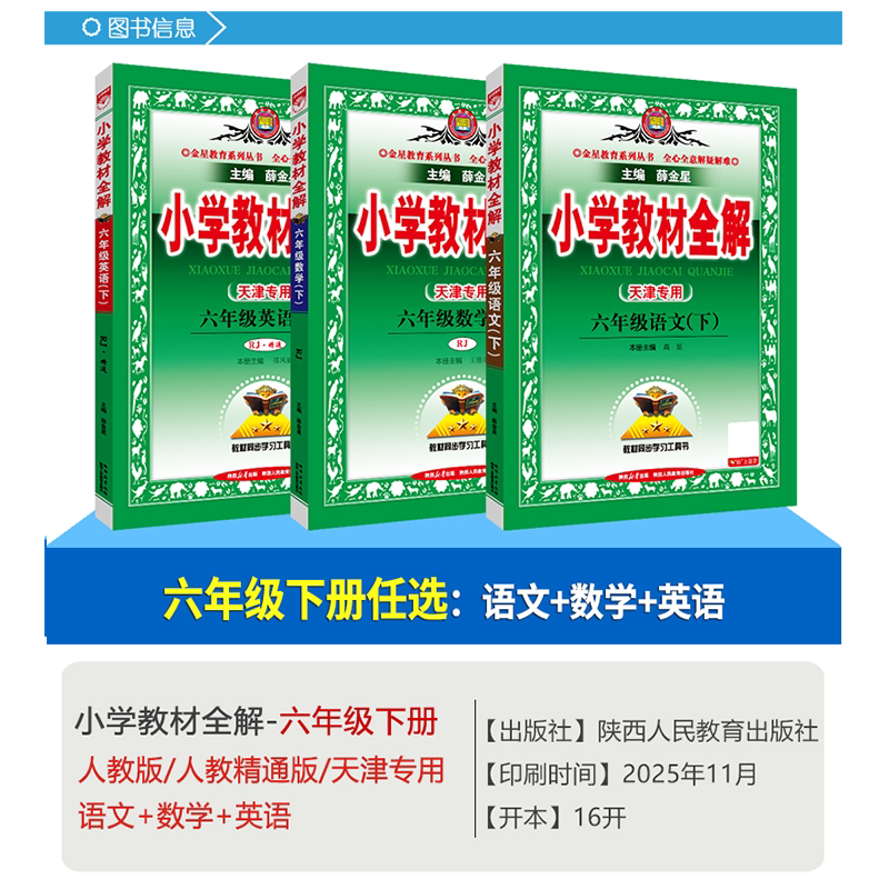 《天津专用2026小学教材全解》是一套专为天津地区小学生设计、与现行人教版语文、数学、英语及科学课本完全同步的辅导资料,涵盖一至六年级上下册全部内容。由知名教辅专家薛金星主编,紧扣新课标要求,系统梳理每课知识点,包含课文解析、重点难点突破、例题精讲、课后习题详解及拓展练习,帮助学生高效预习、巩固复习。书中结构清晰,语言通俗易懂,配有大量图表和思维导图,便于理解记忆。适用于课堂学习延伸和家庭辅导,是提升学习成绩、夯实基础的优质工具书,深受天津地区师生和家长信赖。
