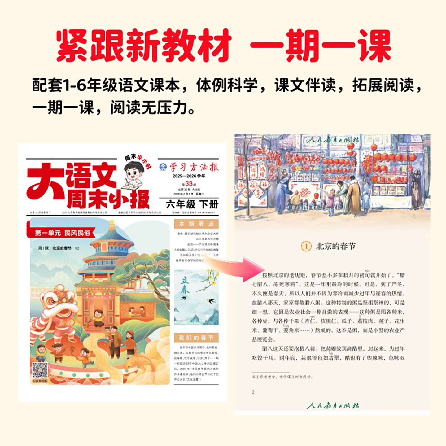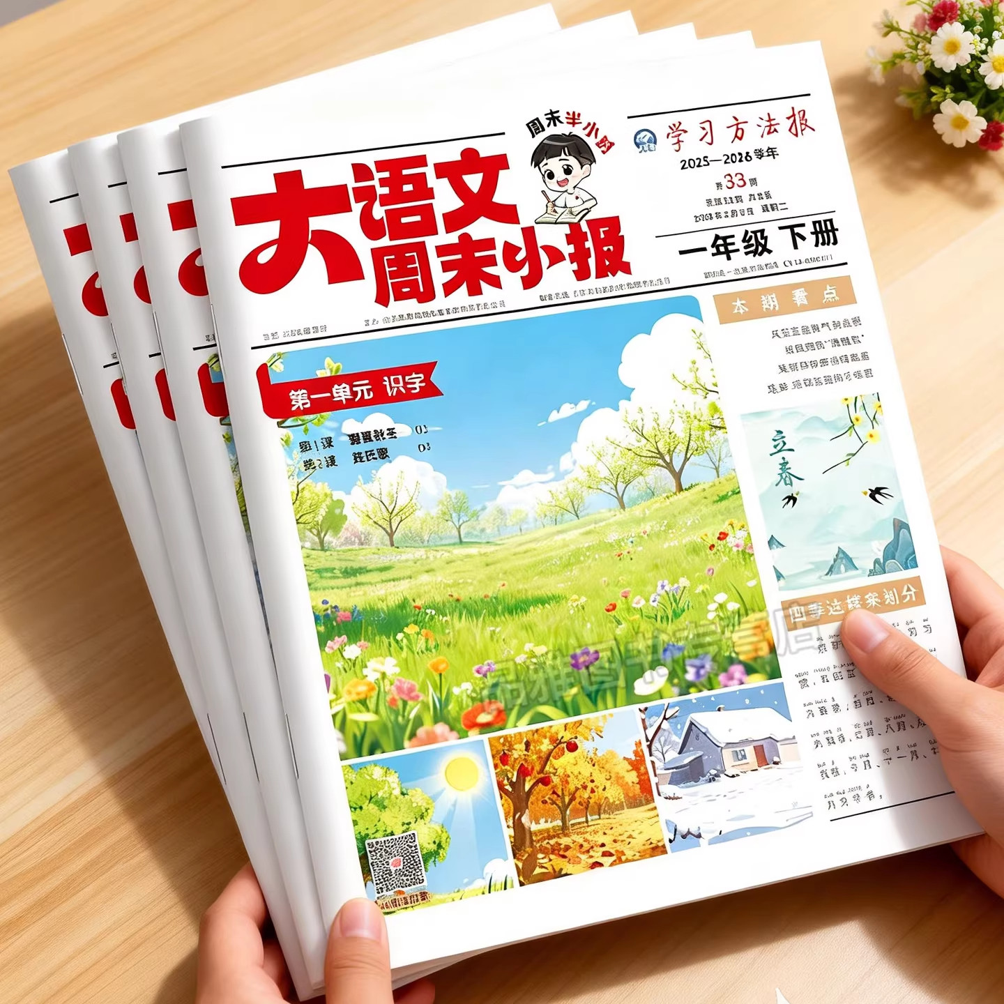 2026新版《学习周报·大语文趣读画报》(周末小报)专为小学一至六年级学生打造,紧扣人教版语文教材,每周一期,每期半小时轻松晚读。内容融合课内拓展与课外趣读,涵盖经典故事、诗词赏析、汉字文化、名家名篇及生活百科,图文并茂,趣味性强。通过主题式阅读设计,激发孩子阅读兴趣,提升语文素养与表达能力。报纸兼具知识性、趣味性与实用性,是孩子周末自主阅读、积累素材、拓展视野的理想读物,助力语文学习“轻负担、高效率”。