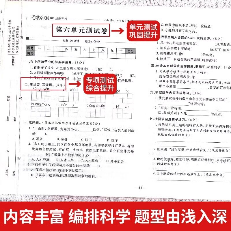 《全优冲刺100分测评卷》是一套专为小学生设计的人教版同步练习与测评资料,涵盖语文、数学、英语三科,适用于小学一至六年级上下册。试卷紧扣教材知识点,题型丰富多样,包括基础巩固、能力提升和综合拓展,帮助学生夯实基础、查漏补缺。每套试卷均模拟真实考试情境,配有详细答案解析,便于学生自测和教师、家长辅导。2025年最新版结合新课标要求,注重核心素养培养,强化实际应用能力。无论是日常练习、单元检测还是期末复习,本套测评卷都是提升学业成绩、冲刺满分的优质学习工具,助力小学生高效学习、全面发展。