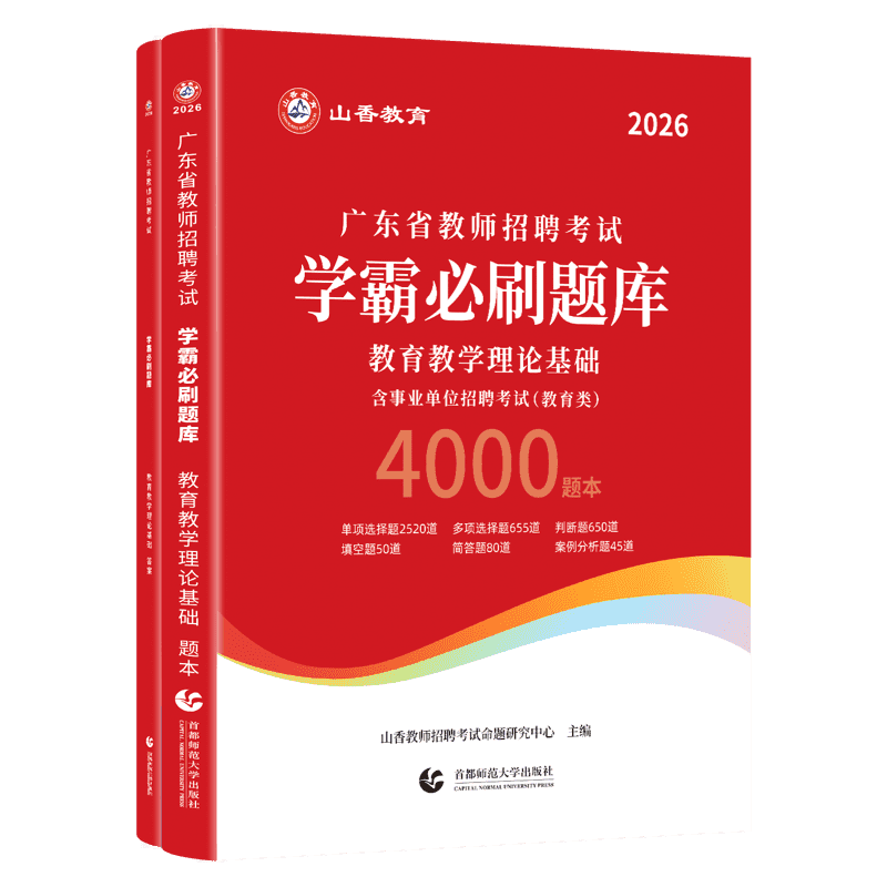 2026山香教育广东省教师招聘考试题库试卷真题学霸必刷题库,专为备考广东教招考生精心打造。本题库紧扣最新考试大纲,全面覆盖教育学、心理学、教育教学理论等核心基础知识,精选历年真题及高质量模拟题,题型丰富、难度适中,助力考生夯实基础、突破重点。每道题目均配有详细解析,帮助理解考点逻辑,提升应试能力。题库结构科学,按章节分类训练,支持专项突破与综合演练,是广大考生高效备考、冲刺高分的必备利器。山香教育凭借多年教研经验,确保内容权威、实用,助力考生顺利上岸,成就教师梦想。