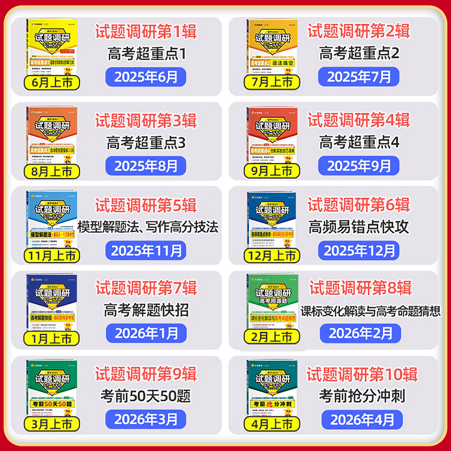 《2026试题调研》系列(第八、九、十辑及第五辑)由天星教育精心打造,专为2025届高三学生冲刺新高考设计。涵盖语文、英语、数学、物理、化学、生物、政治、历史、地理九大学科,紧扣新课标与高考命题趋势,精选典型试题,深度解析重难点。其中“写作高分技法”与“作文素材”专题聚焦语文写作能力提升,提供实用技巧与鲜活素材,助力考场作文脱颖而出。全书结构清晰、内容前沿,融合真题演练与能力突破,是高三学子高效复习、精准提分的权威备考资料,助力考生在2026新高考中斩获佳绩。