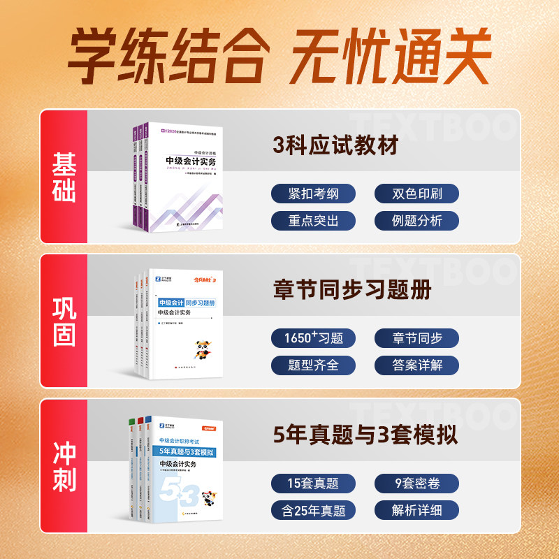 【赠26年精讲网课】中级会计职称备考套装,专为2026年考生量身打造!包含官方推荐教材、2025年最新版《奇兵制胜3》必刷题库、近五年历年真题试卷,全面覆盖《中级会计实务》《经济法》《财务管理》三大科目。配套之了课堂&知了平台26年精讲网课,名师系统讲解重难点,直击考点,高效提分。题库精选高频考题,强化实战训练,助力考生夯实基础、突破瓶颈。资料权威、内容精准,是中级会计职称通关的得力助手,助您一次取证,成就职业新高度!