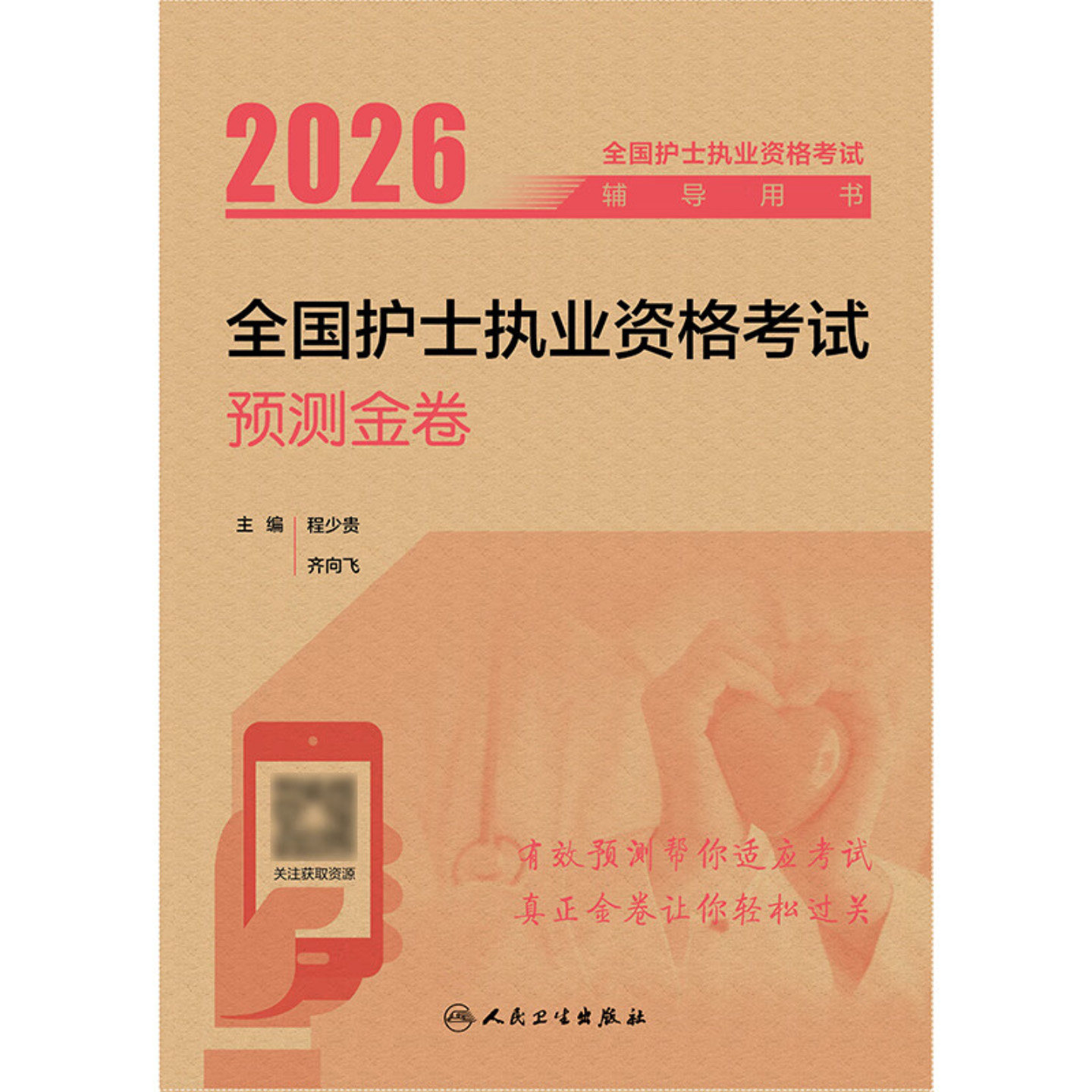 人卫版2026年全国护士执业资格考试预测金卷(模拟卷)是专为2025年备考护资考生精心编写的高效复习资料。试卷严格依据最新考试大纲,融合历年真题高频考点与权威教材核心内容,科学预测命题趋势,题型全面、难度贴近实战。包含多套高质量模拟卷、精选练习题及历年真题解析,帮助考生系统梳理知识、强化应试技巧。题目解析详尽,重点突出,助力高效刷题、查漏补缺。无论是基础巩固还是冲刺提分,本套资料都是护考通关的得力助手,助您轻松应对考试,顺利取得护士执业资格。军医版与人民卫生出版社联合推荐,品质保障,值得信赖。