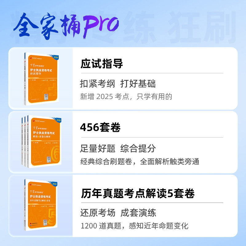 2026年新版《丁震护士资格考试应试指导+456套卷+历年真题全家桶Pro》(原军医版)是专为护考考生打造的高效备考套装。内容涵盖最新考试大纲,系统梳理核心知识点,搭配456套高质量押题试卷及近十年真题精析,全面覆盖高频考点与易错题型。电子版题库支持多端使用,智能组卷、错题收藏、模拟考试等功能助力高效复习。原军医版权威品质延续,题目精准、解析详尽,帮助考生快速掌握应试技巧,提升通过率。无论是基础巩固还是冲刺提分,本全家桶Pro都是护考通关的得力助手,助力考生轻松过护考。