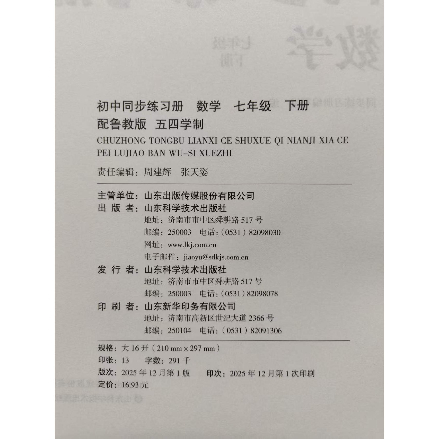 2026春五四制鲁教版初中同步练习册数学七年级下册山东科学技术社54制鲁教版初二7年级数学下册同步练习册配鲁教版